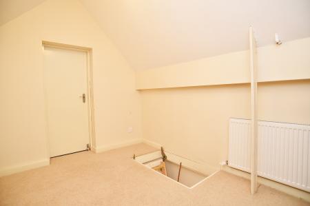 With storage cupboards and pull-down ladder leading to 2 attic rooms, carpeted, plastered with light.
