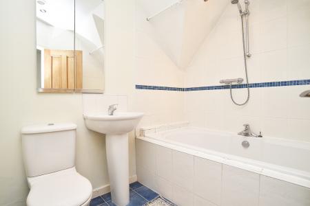 White suite comprising bath with shower over, low-flush WC and pedestal washbasin.