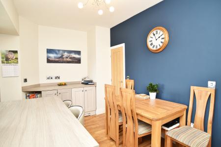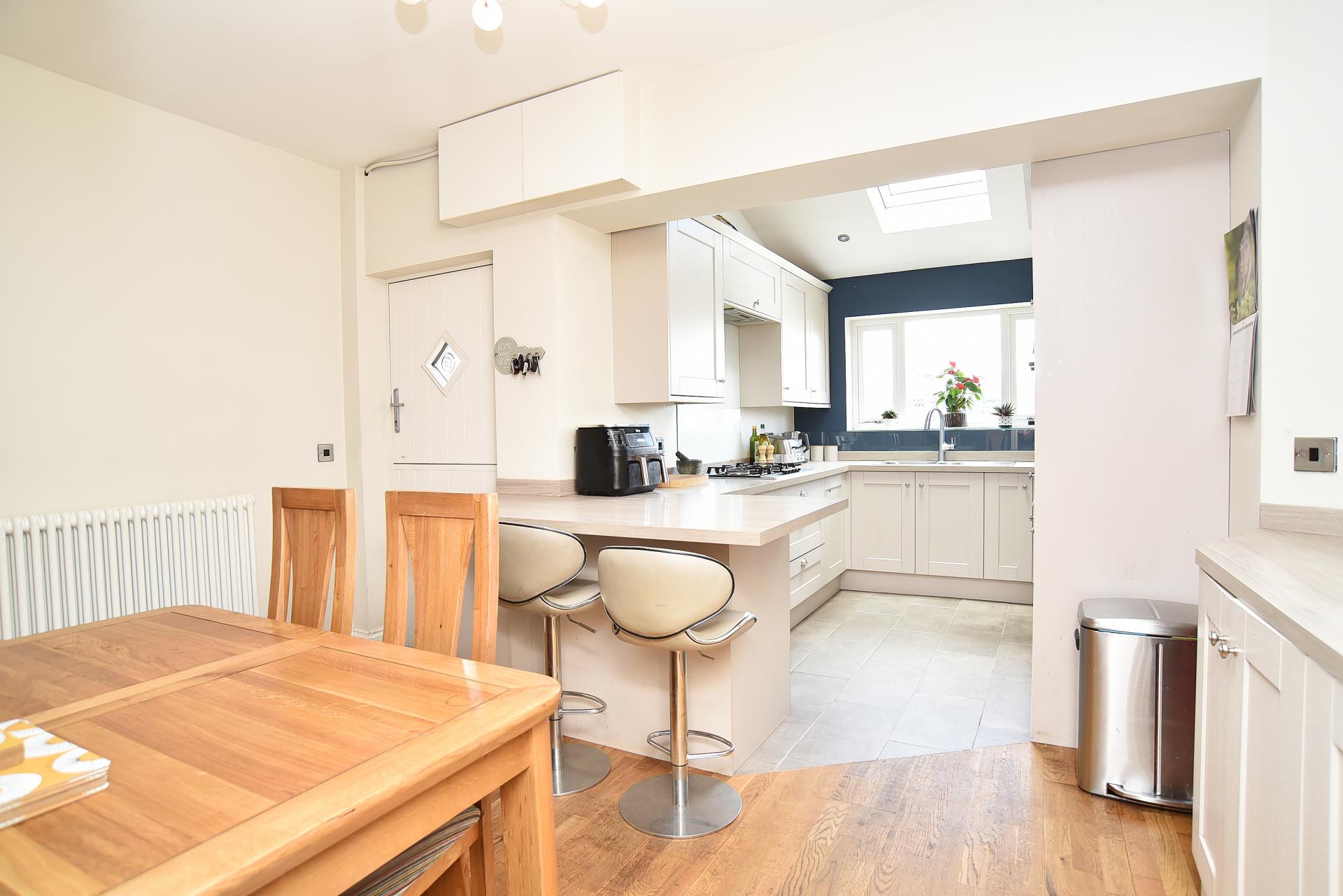 The kitchen has been extended to create a stunning open-plan space with dedicated dining area. Features include fitted cabinets, integrated appliances, breakfast bar, and quality finishes throughout.
