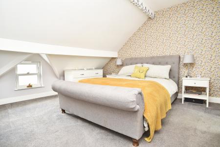 A large double bedroom with en-suite and useful eaves storage. A peaceful top-floor retreat with elevated views.