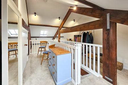 A further double bedroom with vaulted ceiling and en-suite. Fitted stairs lead to a mezzanine level providing useful and versatile additional space with potential to be used as an office or dressing room.