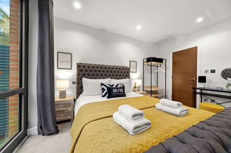 An inner hallway leads to two well-proportioned double bedrooms. The principal bedroom comfortably accommodates a king-size bed and benefits from glazed doors opening to a second private outdoor sitting area, and a modern en-suite shower room with contemporary fittings and tiling. The second bedroom accommodates a double bed.
