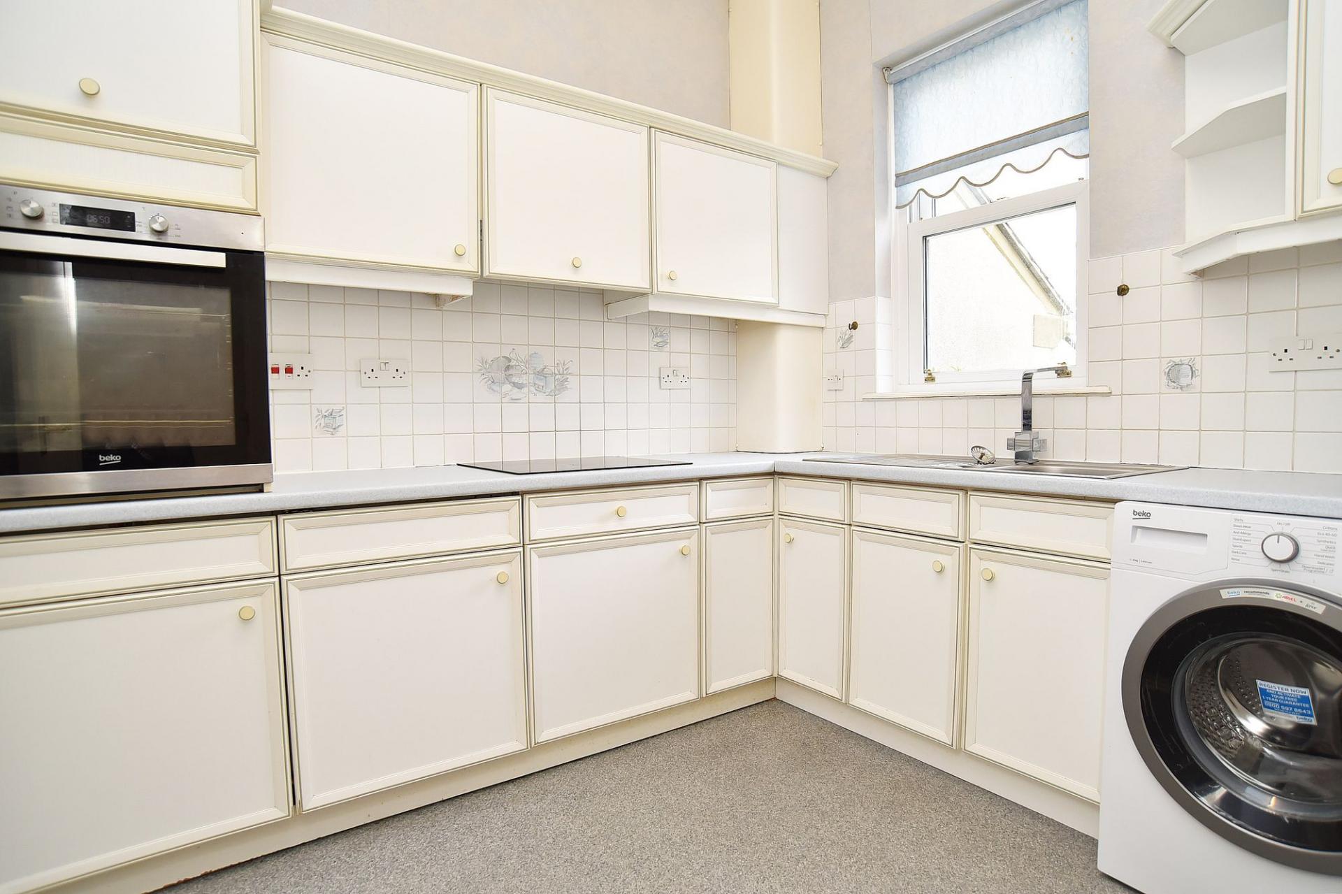 The kitchen has a window overlooking the attractive communal gardens and comprises a range of fitted base and wall units with worktops, stainless-steel sink unit, tiled splashbacks and under-unit lighting. Integrated appliances include an induction hob and eye-level oven, and there is a washing machine.