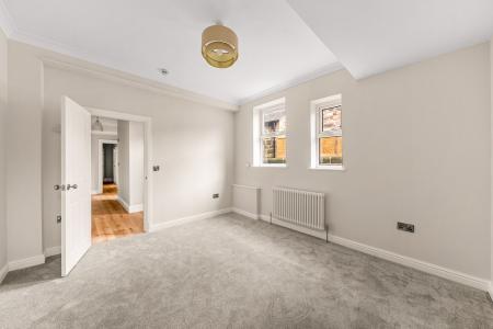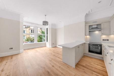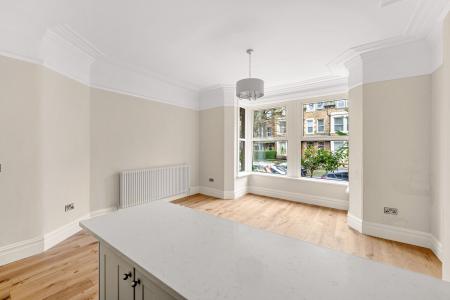 The impressive open-plan living/kitchen area is a superb, light-filled space featuring high ceilings with ornate cornicing and a large bay window that floods the room with natural light. The stylish shaker kitchen has been recently fitted and has quartz worktops, new, premium range integrated appliances and a peninsula breakfast bar, perfectly designed for both everyday living and entertaining. Quality wood flooring and recessed lighting complete this elegant room, seamlessly blending period charm with contemporary design.