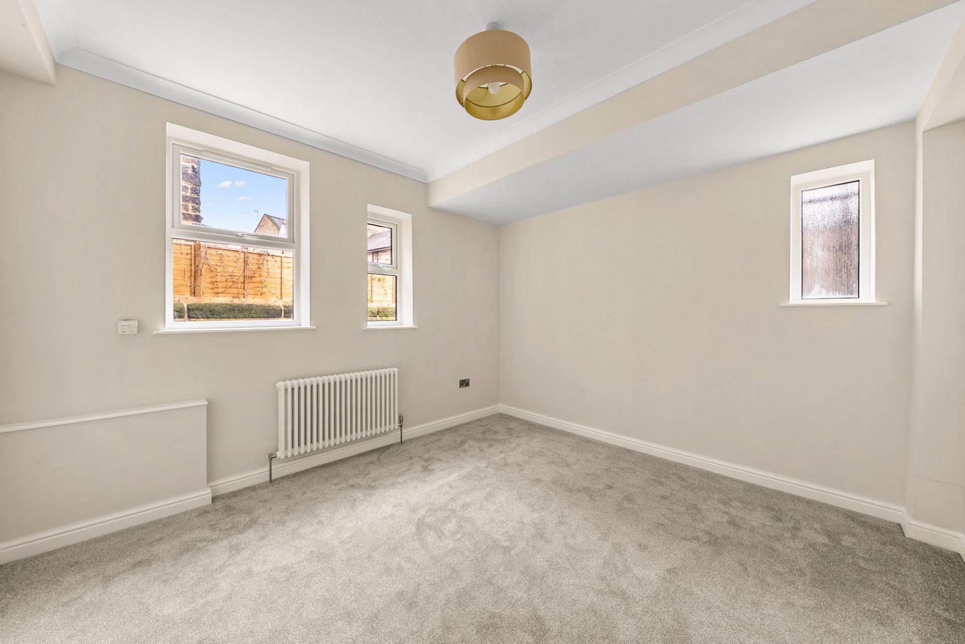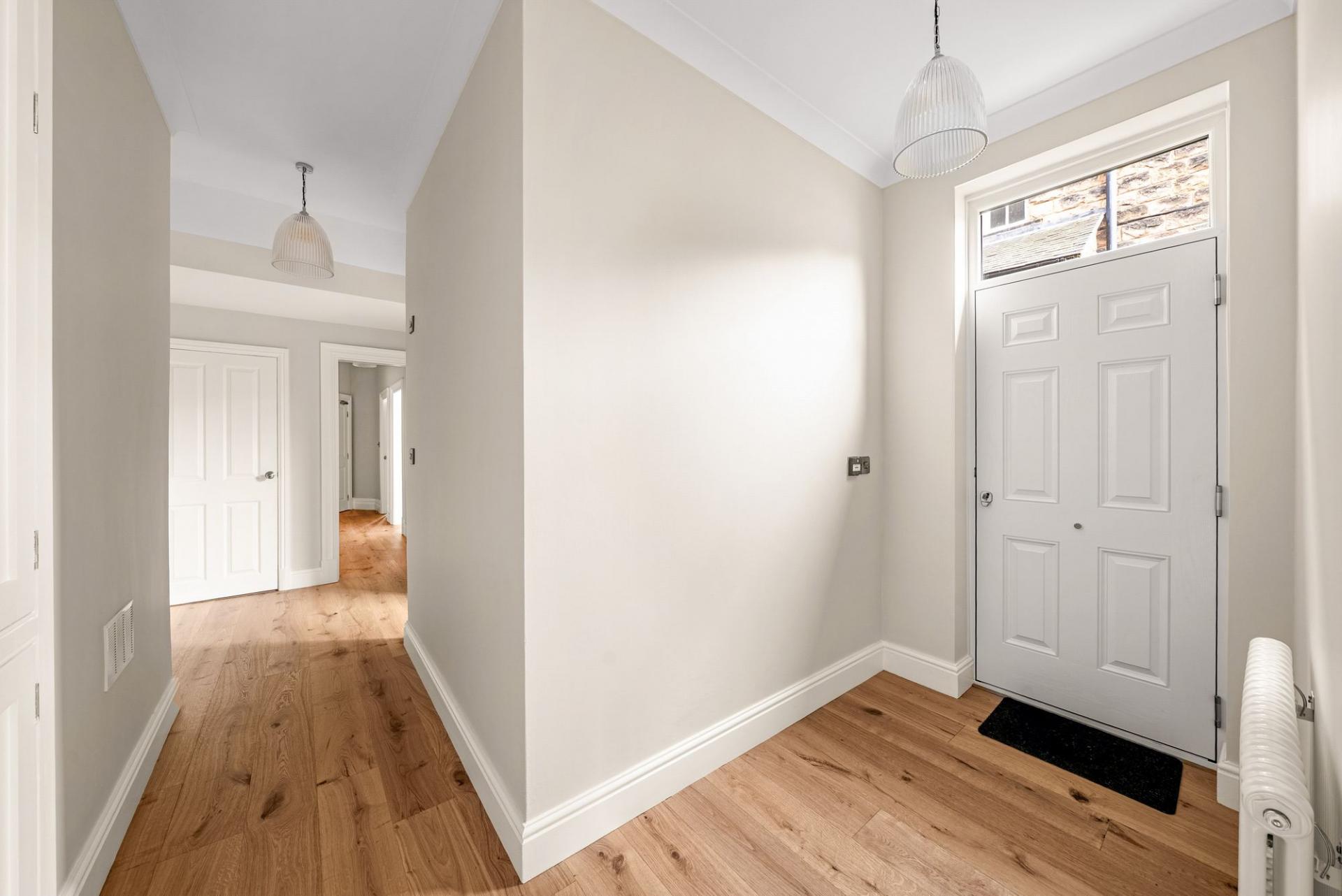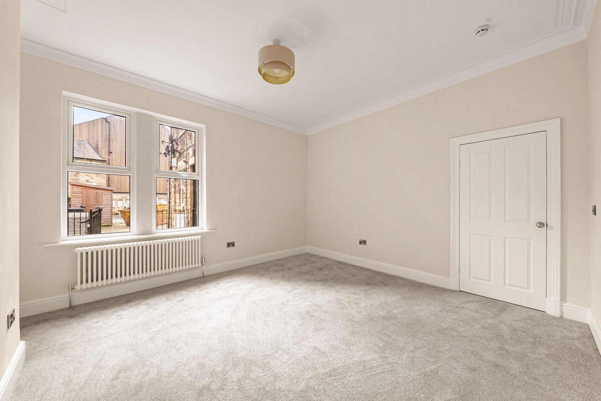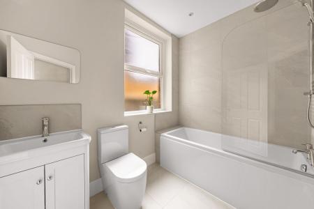 The substantial principal bedroom is a beautifully proportioned double room, finished in soft neutral tones with quality fitted carpeting and a stylish column radiator, creating a calm and inviting retreat. A further generous double bedroom offers excellent natural light and versatility, ideal as a guest bedroom, home office or additional reception space. The contemporary house bathroom is stylishly appointed with a modern white suite comprising a panelled bath with glazed shower screen and rainfall shower over, low flush WC and vanity unit with inset wash basin. Elegant porcelain tiling, premium fittings and a heated chrome towel rail ensure the exceptional standard continues throughout.