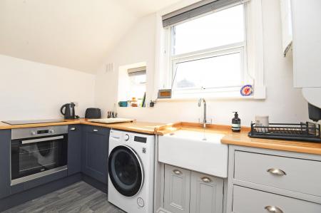 With base units and complementary wooden work surfaces, white ceramic Belfast sink with chrome taps, under-counter built-in oven, ceramic glass hob, space and plumbing for washing machine, space for under-counter fridge. Wall-mounted Worcester combination boiler, windows to rear and central heating radiator.