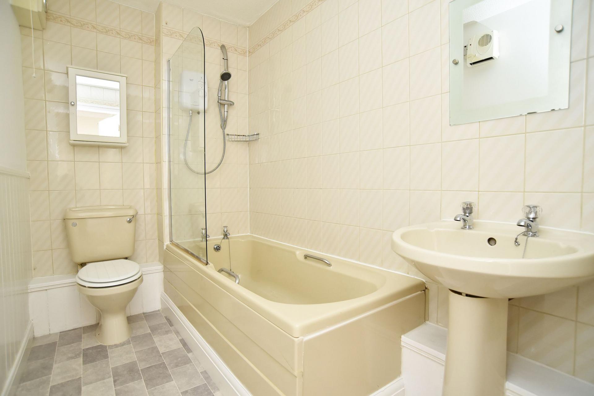 Comprising panelled bath with shower over, low-flush WC and wash basin.