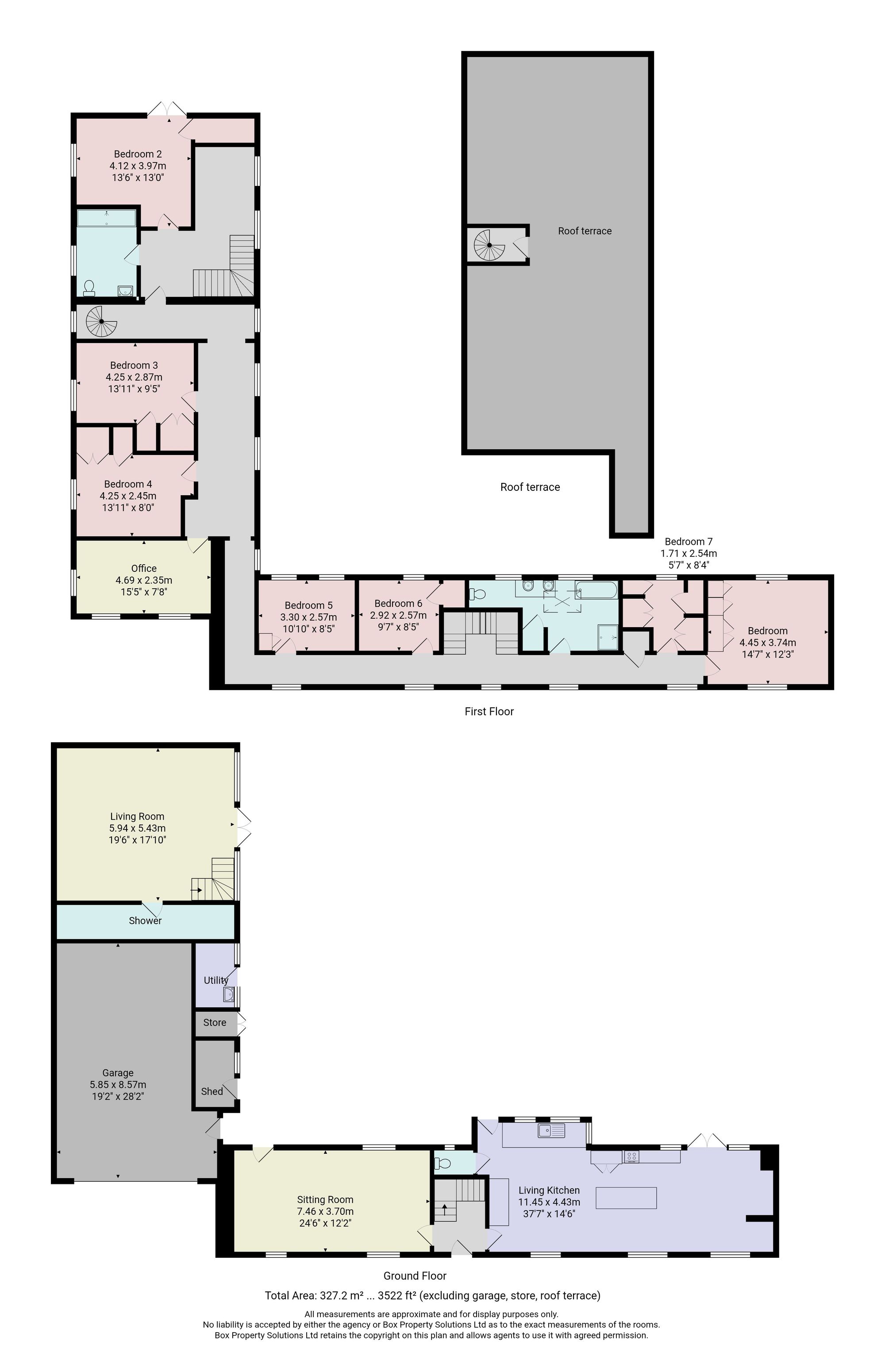 The first floor provides extensive and flexible accommodation comprising six well-proportioned bedrooms, together with a dedicated home office and a fully fitted dressing room. Two luxurious bath/shower rooms serve the bedrooms, finished to a high standard. A spiral staircase leads to the spectacular roof terrace, a standout feature of the property which provides a superb outdoor entertaining area enjoying beautiful views across the surrounding countryside. Power and water supplies are already in place, offering the opportunity to create an outdoor kitchen if desired.