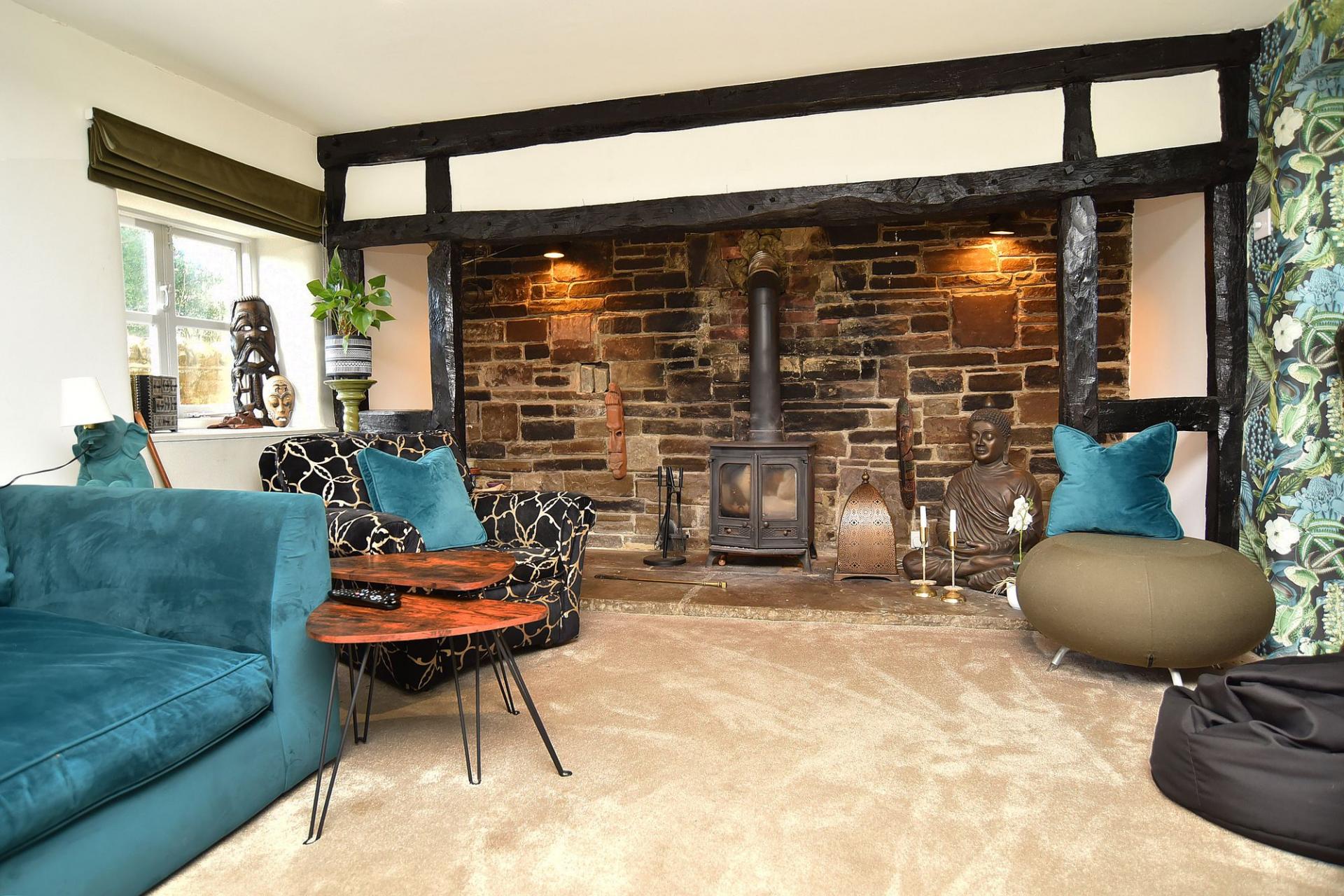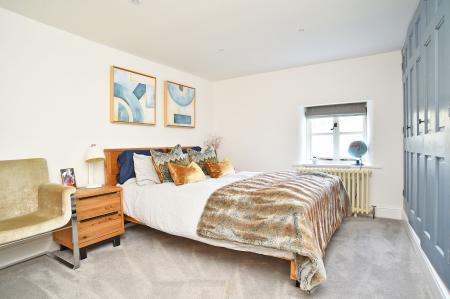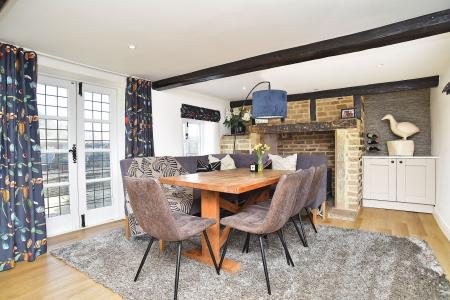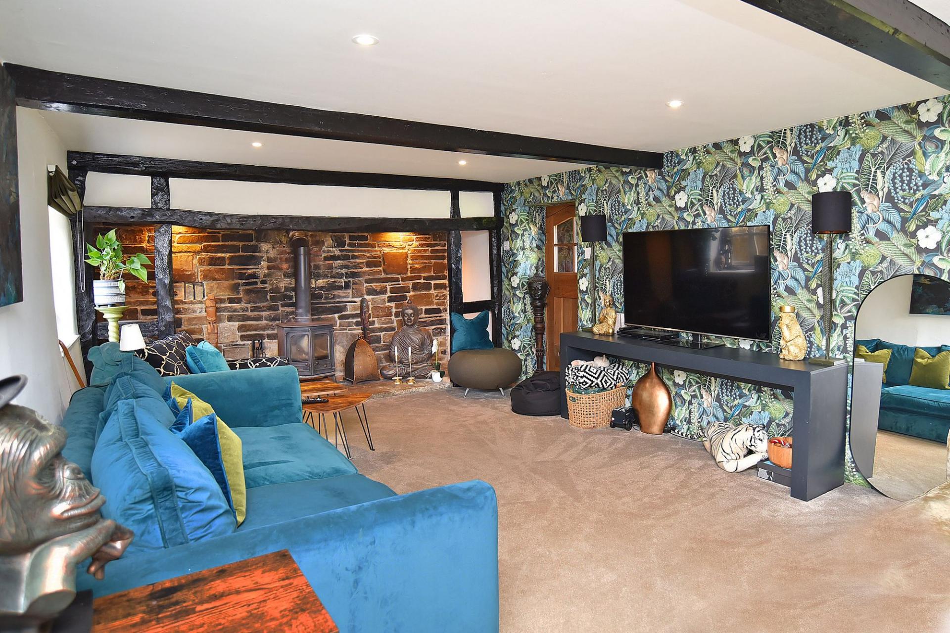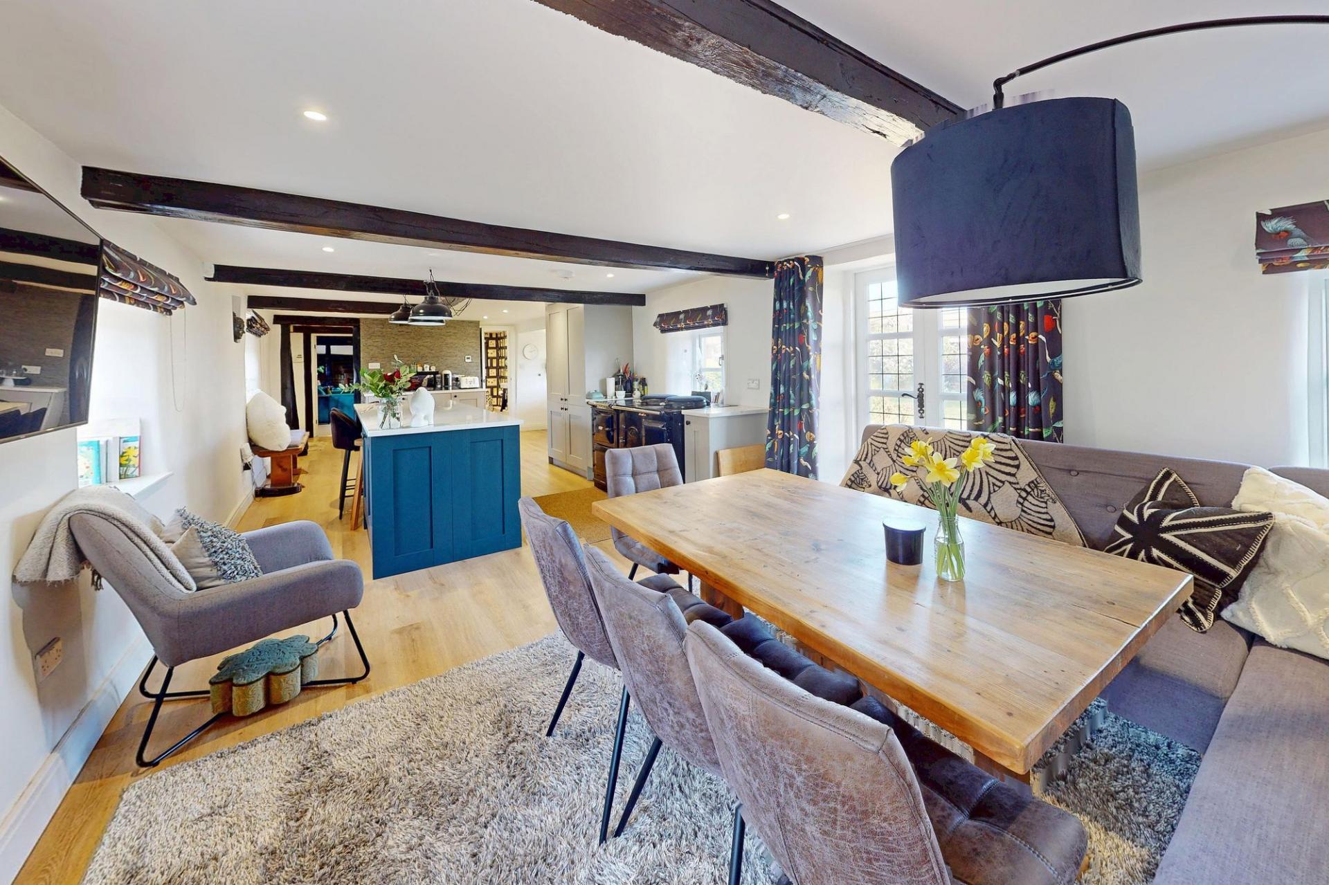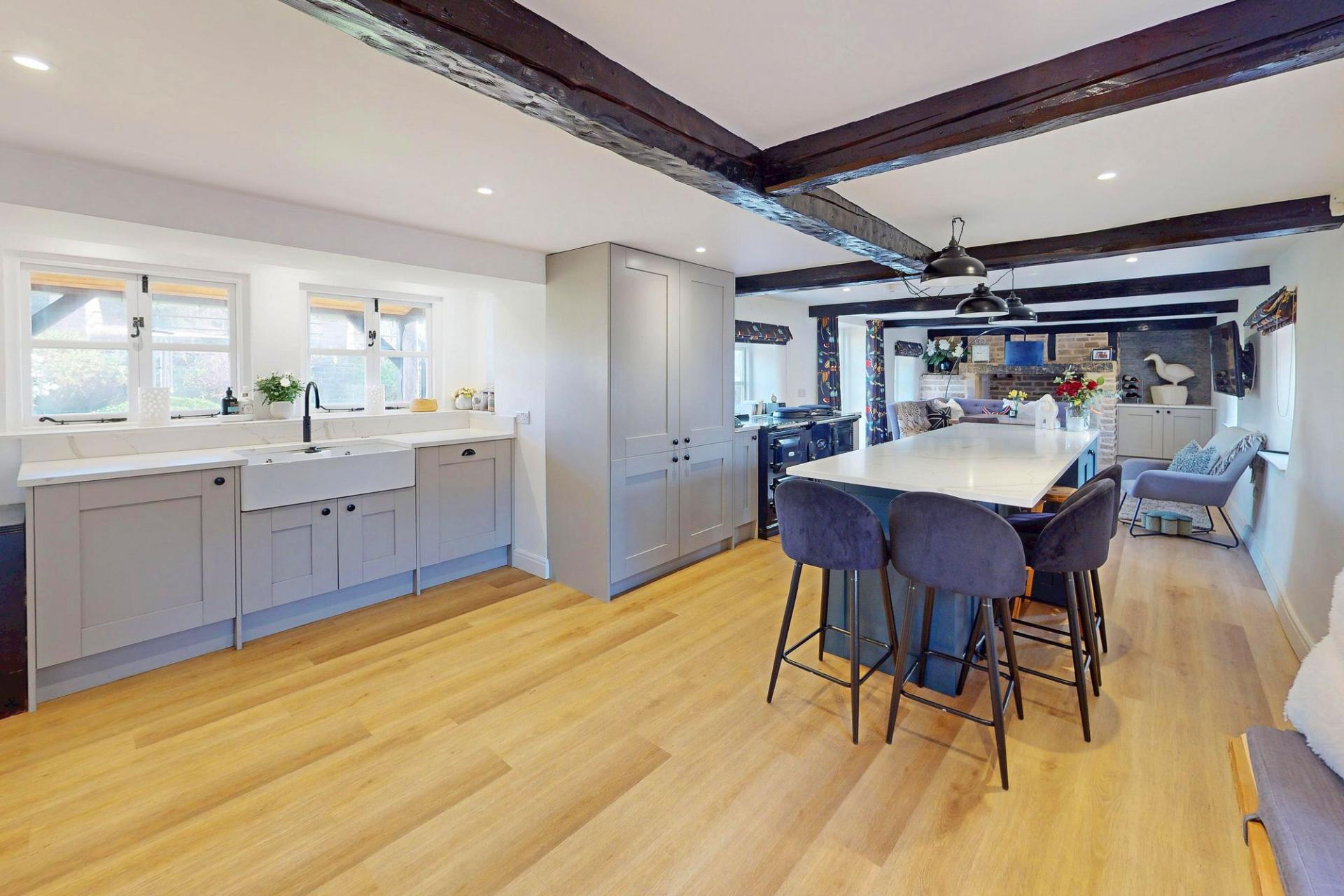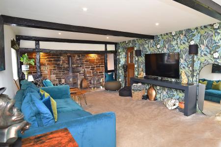 The superb living / dining kitchen forms the heart of the home and has been expertly created by combining two former reception rooms. The result is an impressive and sociable entertaining space fitted with an attractive range of Shaker-style cabinetry, complemented by a central island with breakfast bar seating, integrated appliances, Aga range, Belfast sink, Quooker boiling tap and waste disposal unit. The adjoining dining area features a charming stone fireplace and bespoke fitted cabinetry, creating a warm and inviting setting for family gatherings. Opposite the kitchen, the sitting room provides a cosy yet elegant retreat with an original inglenook fireplace and solid-fuel stove forming an attractive focal point.