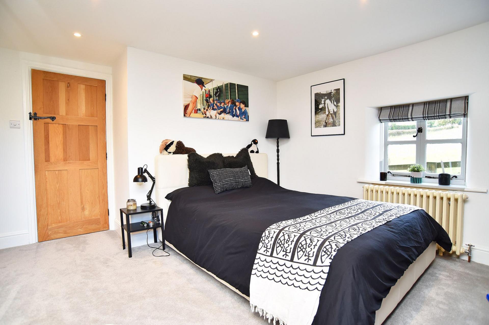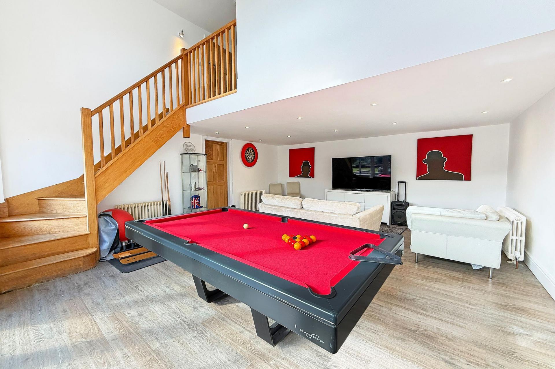 To the rear of the property, the extended section of the house introduces a striking contemporary reception or games room with a double-height ceiling and large windows overlooking the delightful gardens and surrounding countryside. This impressive space has direct access to a sheltered outdoor terrace and is complemented by an adjoining shower room, which offers potential for the installation of a sauna if desired. Additional ground-floor facilities include a guest cloakroom off the kitchen, and a utility room located within one of the adjoining outside storerooms.