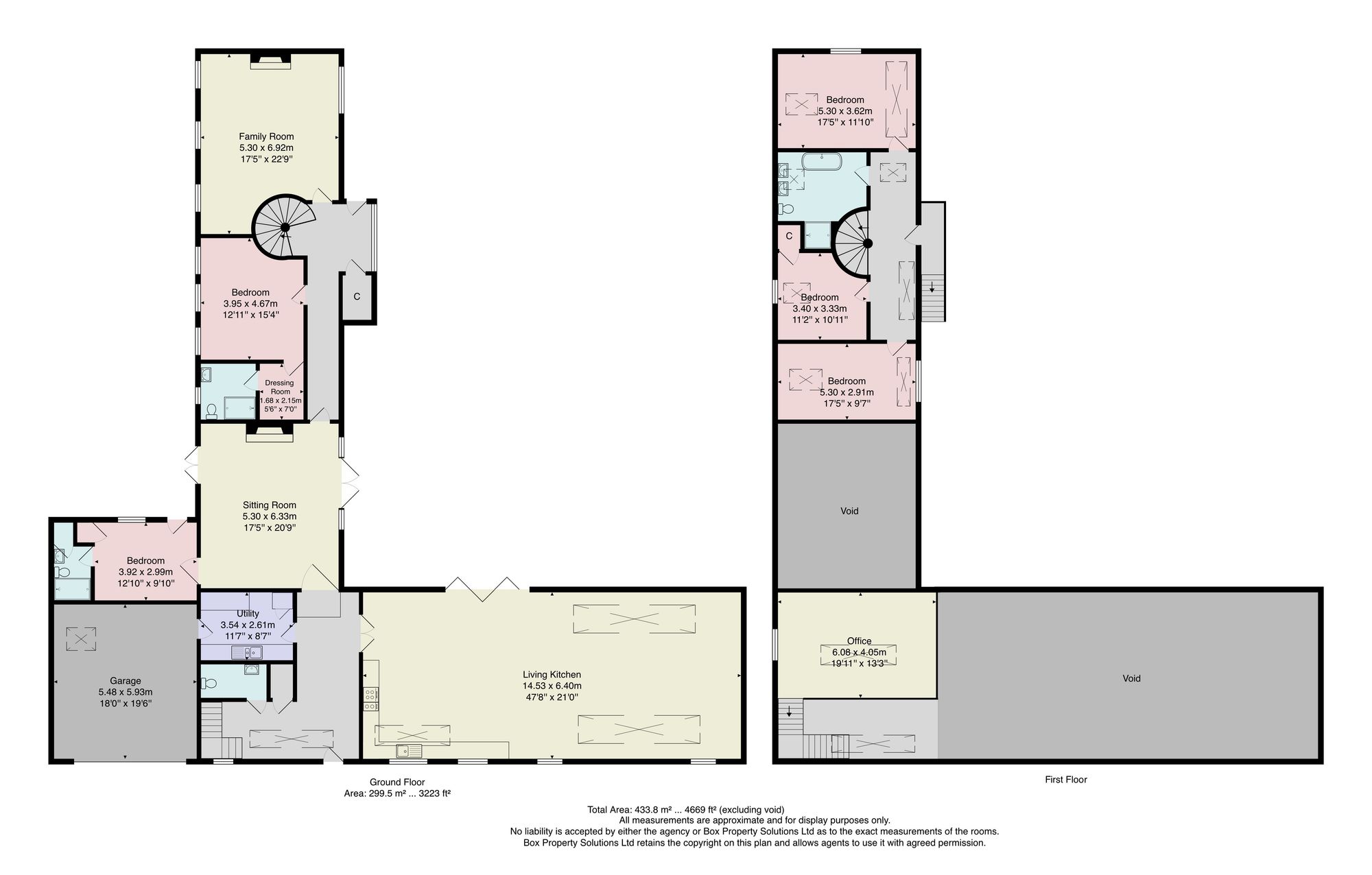 There is ample room for both sitting and dining areas. The stylish kitchen features a range of fitted units with worktops, island and breakfast bar, double Belfast sink, electric-powered Aga and integrated dishwasher.