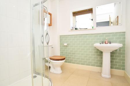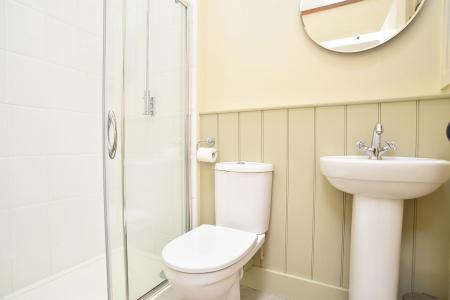Fitted with WC, washbasin and shower. Tiled walls and floor.
