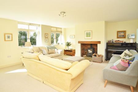 A very spacious reception room with glazed patio doors on two sides and vaulted ceiling. Wood-burning stove.