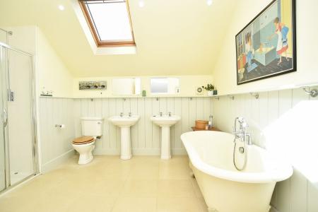 A luxurious bathroom with WC, twin basins, freestanding bath and separate shower.