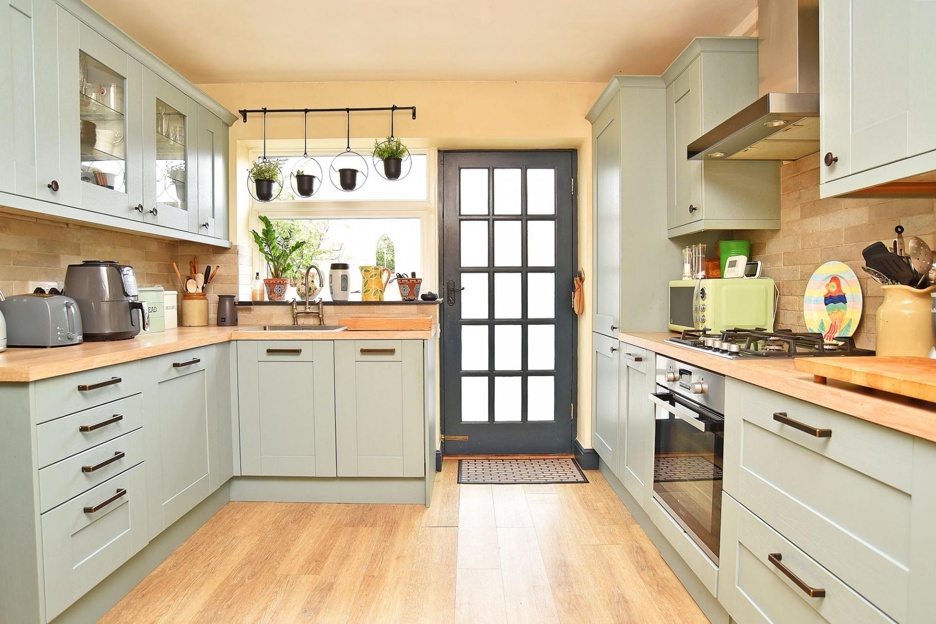 Incorporating a range of wall and base units, oak-effect work surfaces and integrated appliances. External door leads to the rear garden.