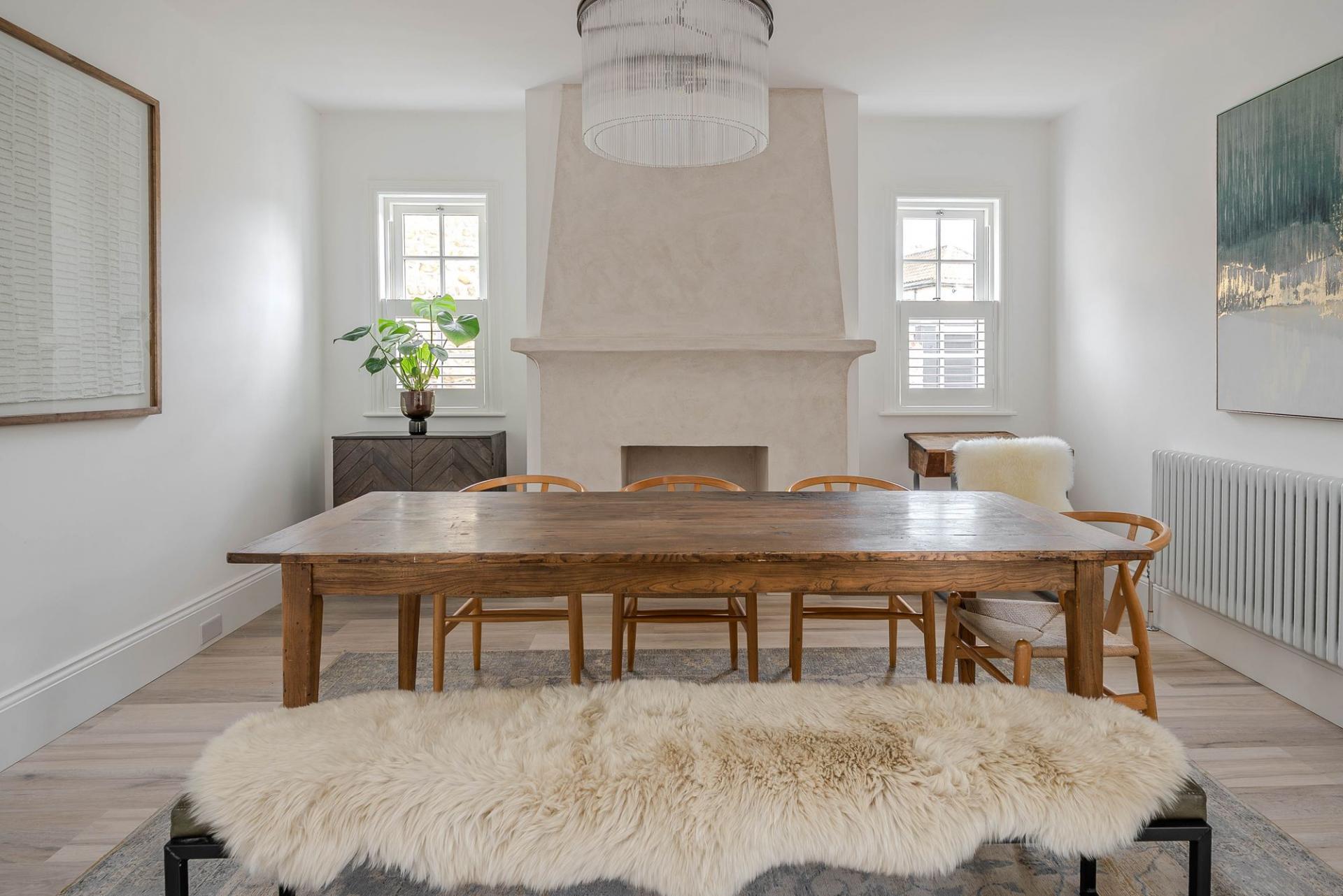 A further reception room providing an excellent dining area with windows to the side and a feature lime-plastered fireplace.