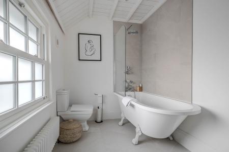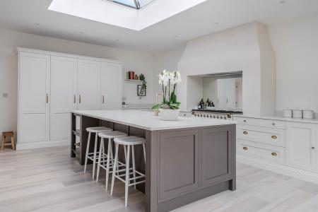 A superb open-plan and particularly spacious kitchen and living area with glazed bi-folding doors opening onto the garden. The kitchen comprises a range of high-quality, stylish fitted units with quartz worktops, island and breakfast bar. Range cooker with lime-plastered hood and extractor, full-height fridge and freezer, integrated dishwasher, and boiling-water tap. Underfloor heating.