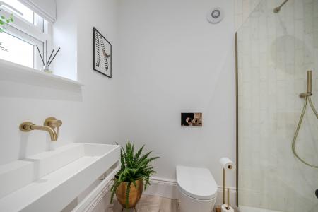 A useful ground-floor shower room with a modern white suite and quality Lusso fittings comprising WC, basin set within a vanity unit and shower. Mandarin Stone tiled walls.
