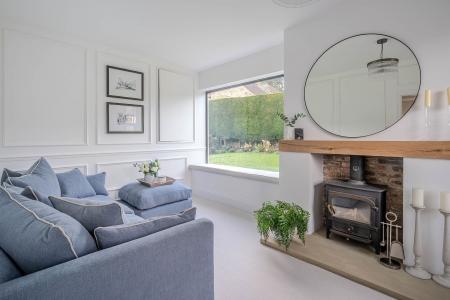 A spacious reception room with window to the front overlooking the green and picture window to the side overlooking the garden. Woodburning stove, fitted cabinets and shelving.