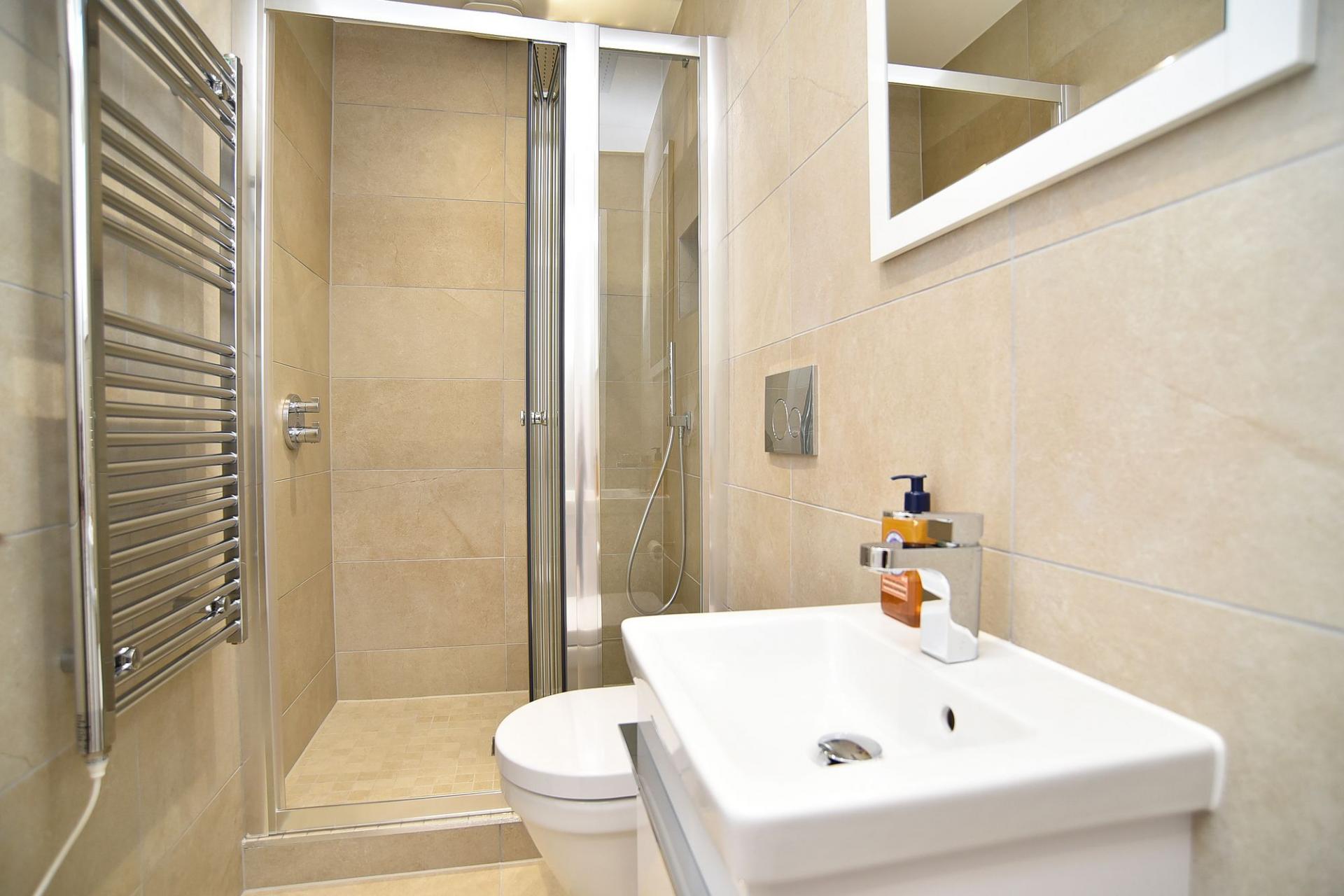 A white modern suite comprising WC, washbasin set within a vanity unit, and shower. Floor-to-ceiling tiling. Heated towel rail.