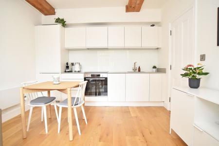 A delightful open-plan living space with sitting and dining areas and a modern fitted kitchen with a range of stylish units. Electric hob, integrated oven, fridge / freezer and dishwasher. Wood flooring.