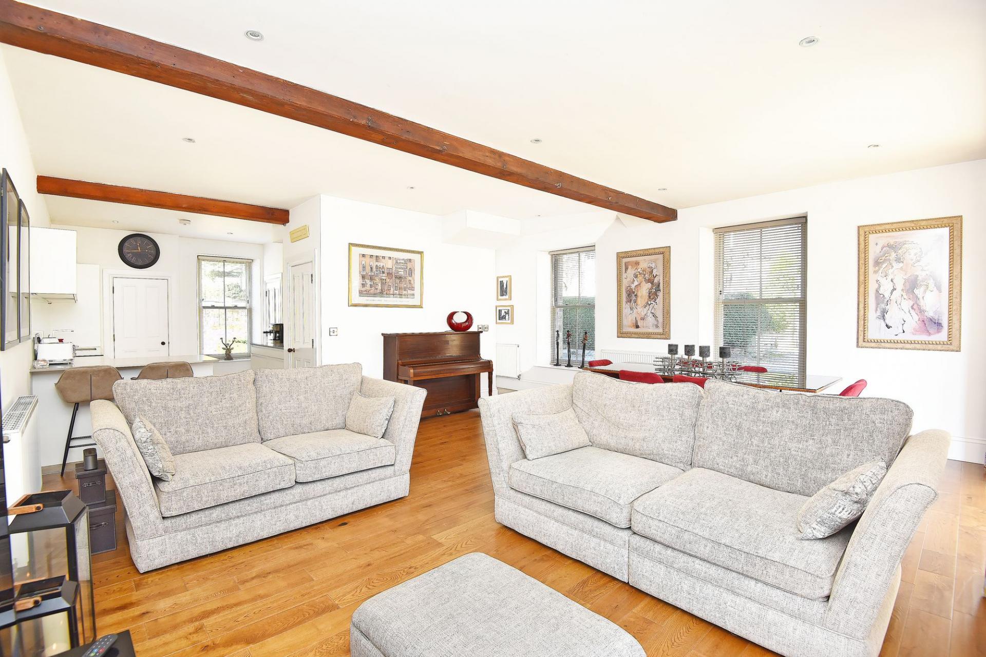 A stunning large reception room with space for sitting and dining. Oak flooring. Glazed patio doors lead to the garden.