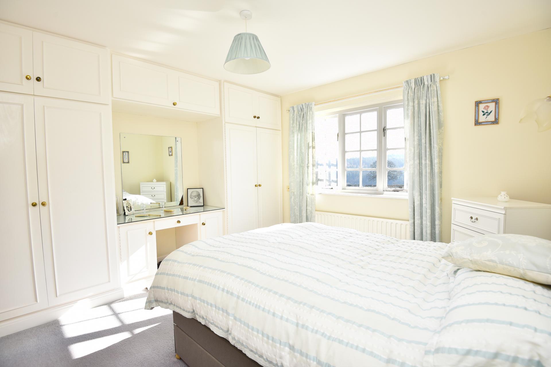 A double bedroom with fitted wardrobes and dressing table.