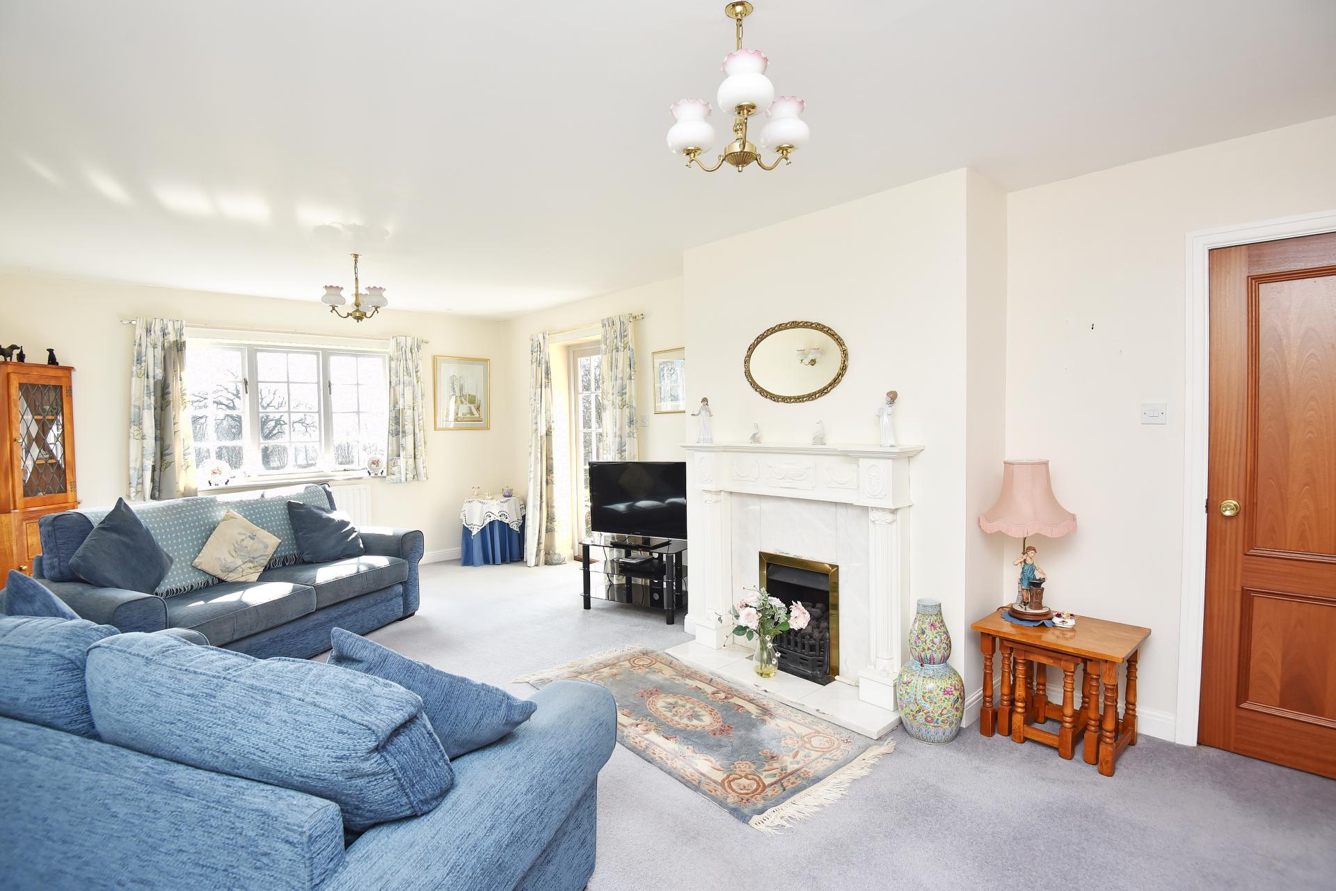 A large reception room with feature fireplace. Window to rear with superb countryside views and a glazed door leads to the garden.