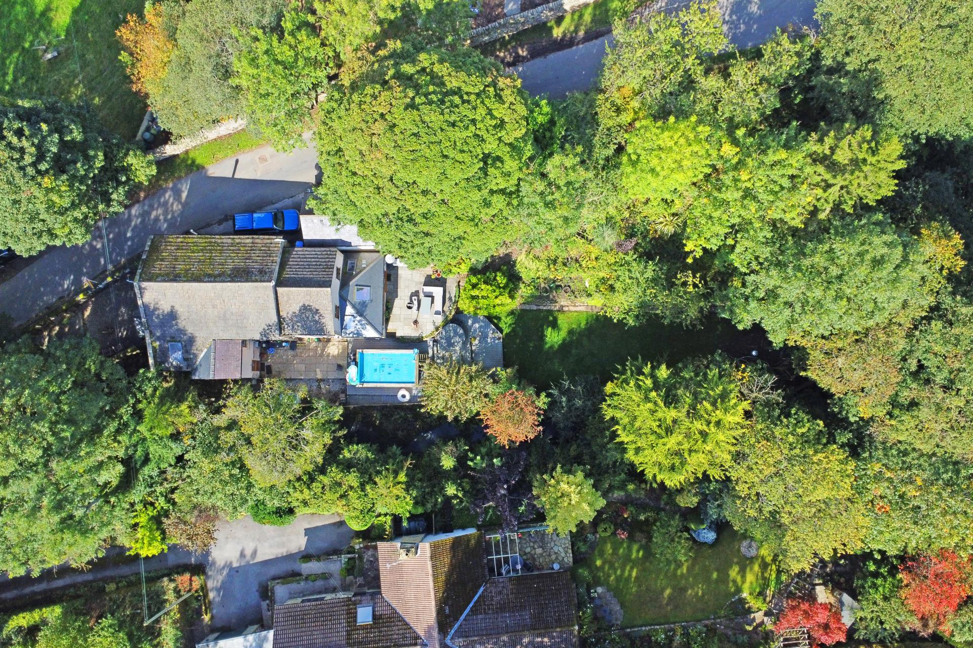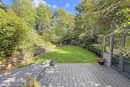 OUTSIDE The property occupies a particularly generous plot having attractive gardens with extensive lawned area, paved and deck sitting space, mature planted borders and a hot tub and small swimming pool . There is also two driveways that provide off-road parking and a single garage. A gateway leads to a further woodland area.