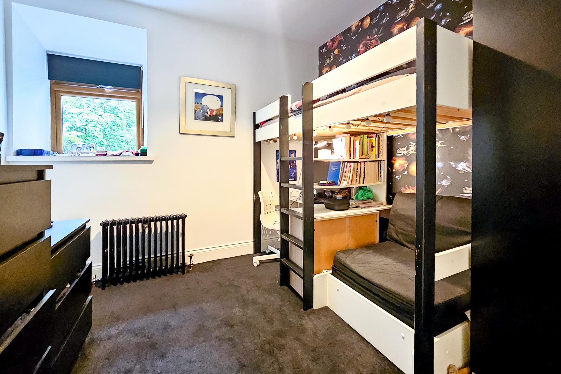 With attractive original features from the chapel with stained-glass windows and vaulted ceiling. Providing a useful workspace which could potentially be easily converted to provide an additional bedroom if required.
