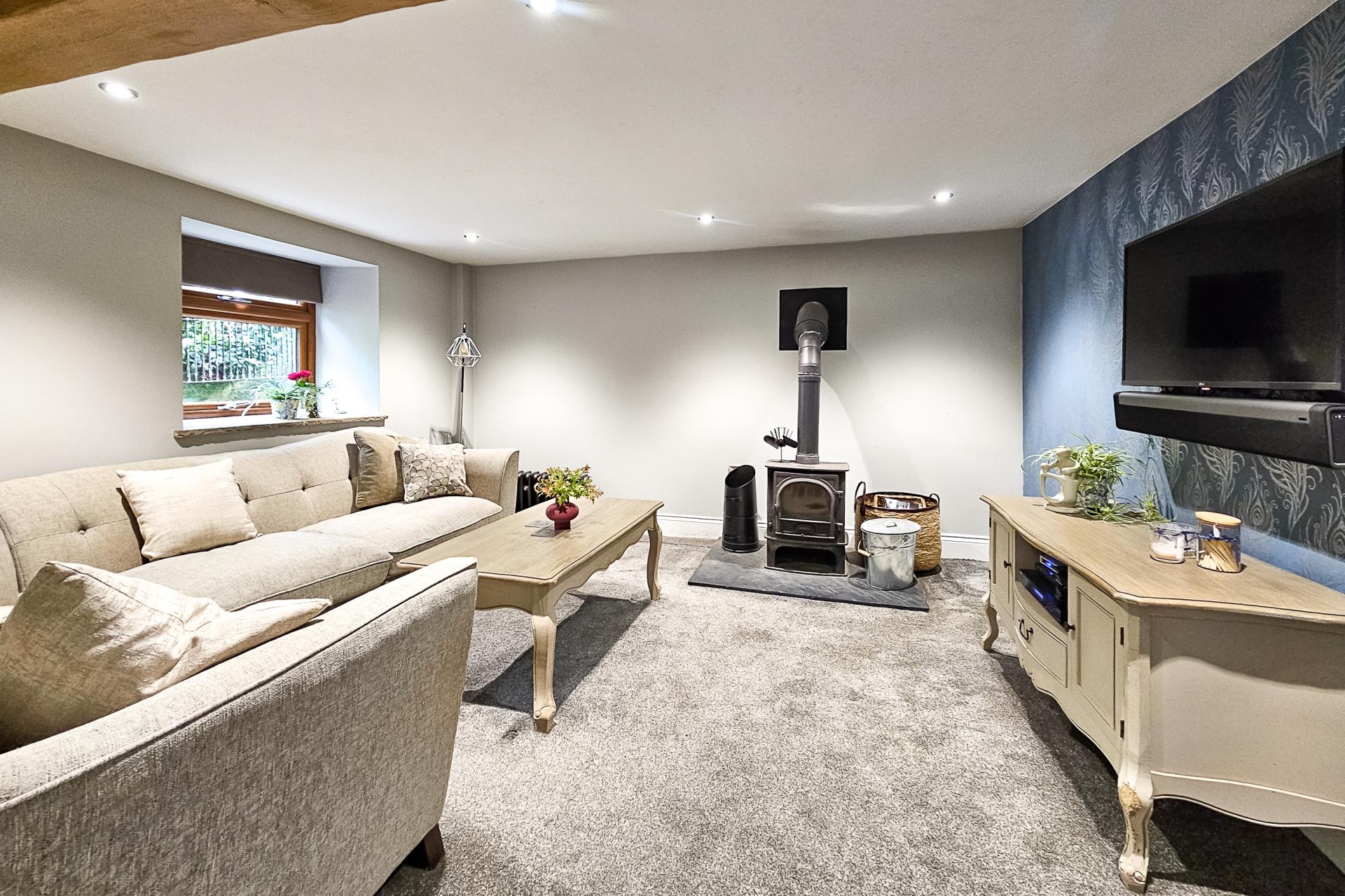 A spacious reception room with wood-burning stove.