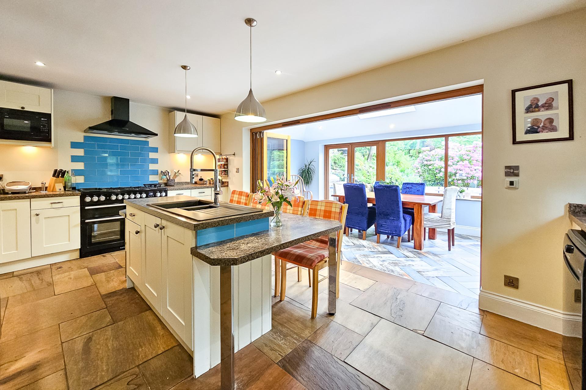 A modern fitted kitchen with a range of wall and base units with island, worktop and breakfast bar. Range cooker and integrated appliances. Glazed bi-folding doors lead to the family room.