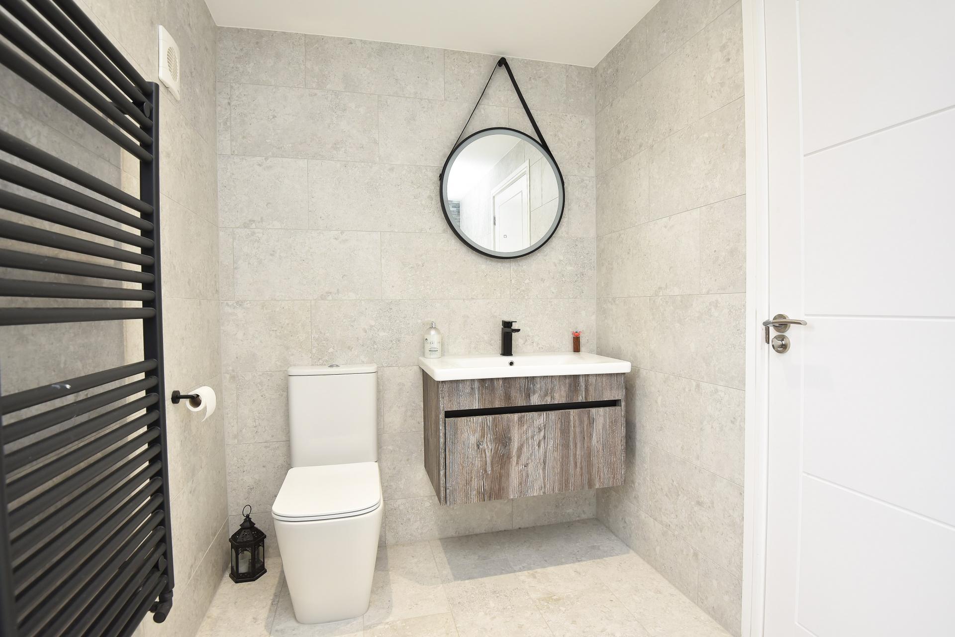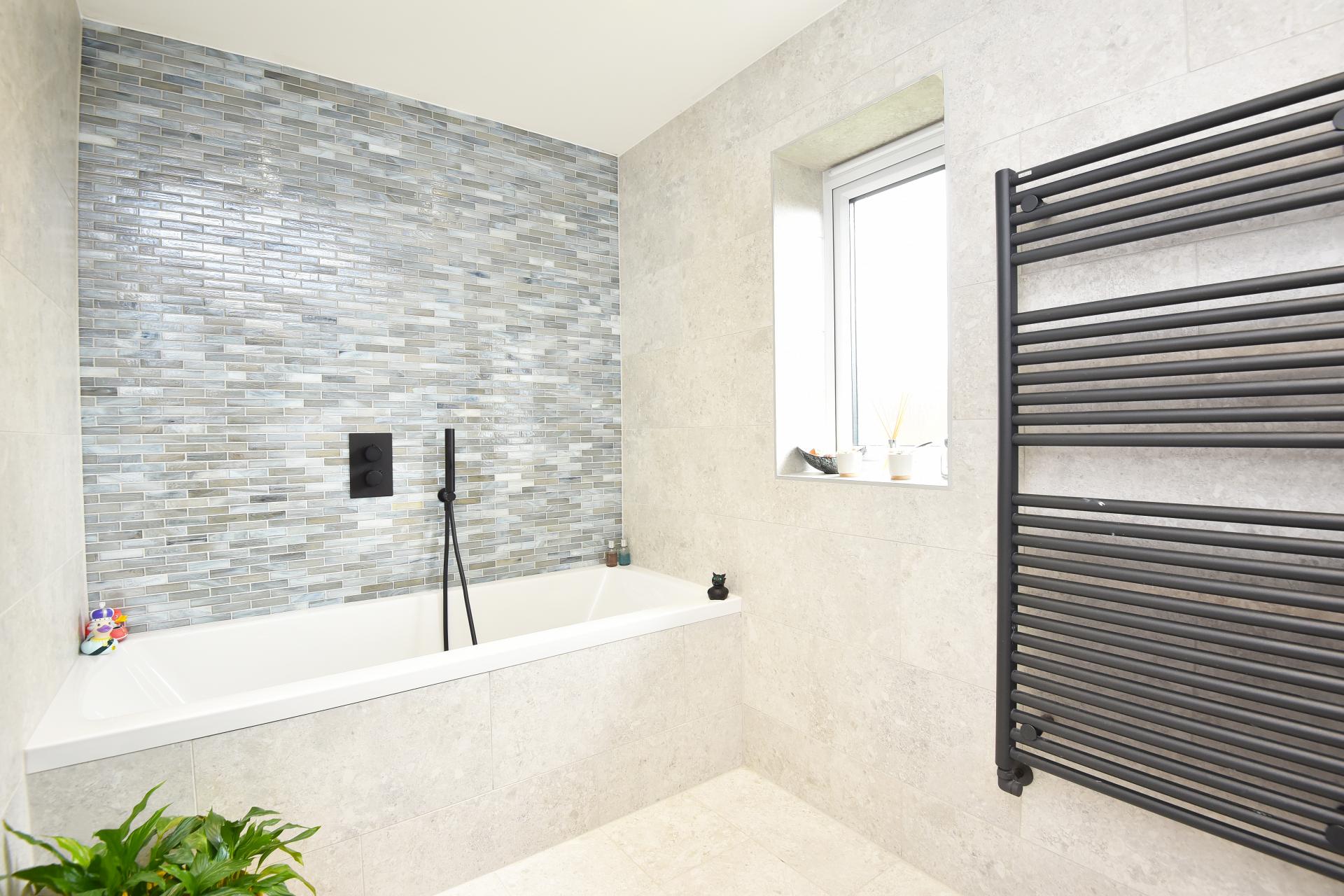 With WC, washbasin set within a vanity unit, and bath. Heated towel rail. Tiled walls and floor.