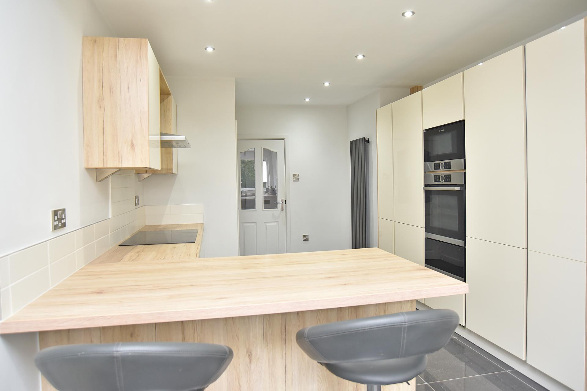 Fitted with a range of stylish modern units, worktops and breakfast bar. Integrated appliances include induction hob, double oven, microwave, warming drawer, fridge freezer, wine fridge and dishwasher. Underfloor heating.