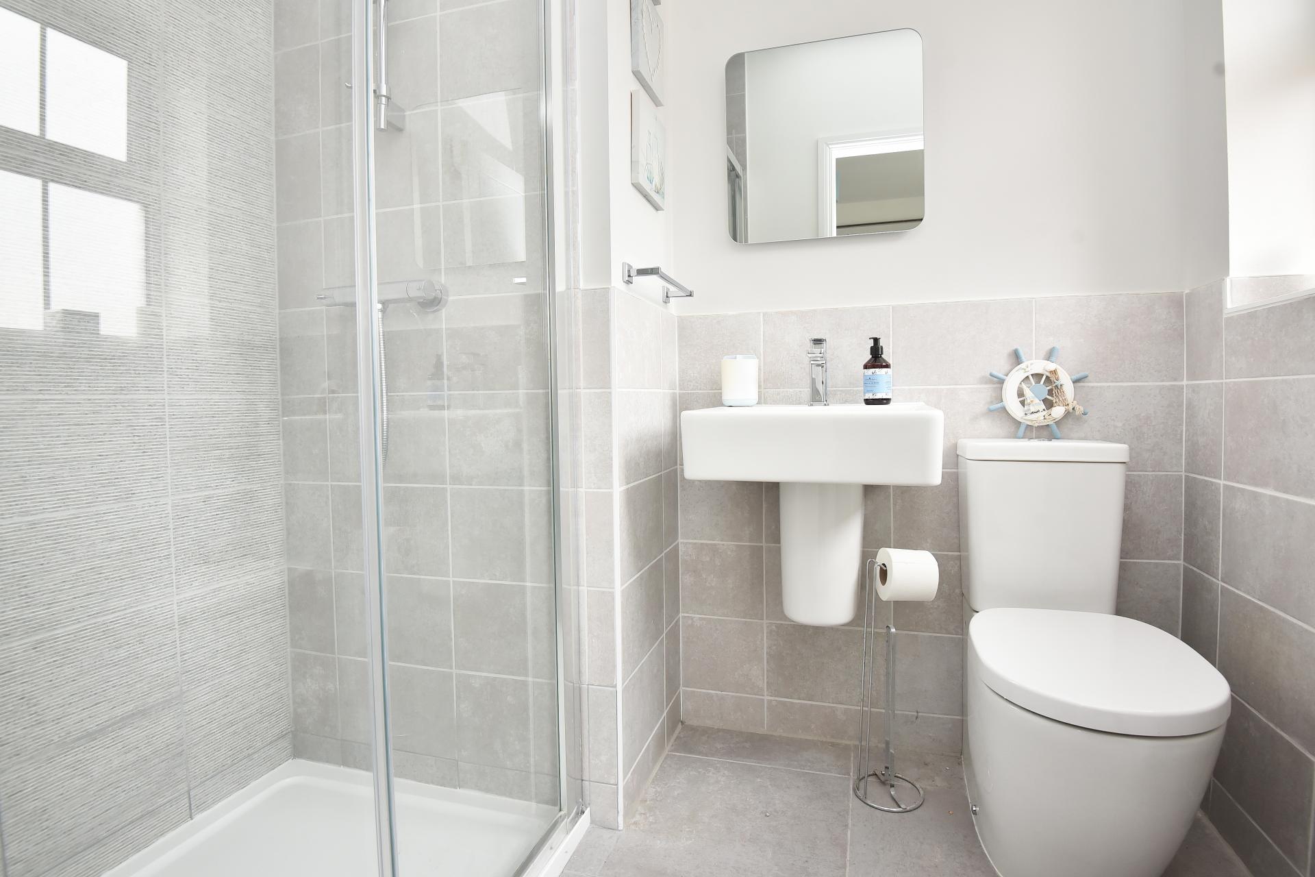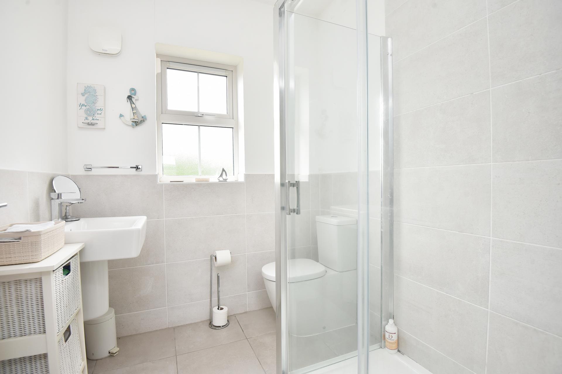 There is a family bathroom with WC, washbasin and bath, plus three en-suite shower rooms, all of which have modern white fittings.