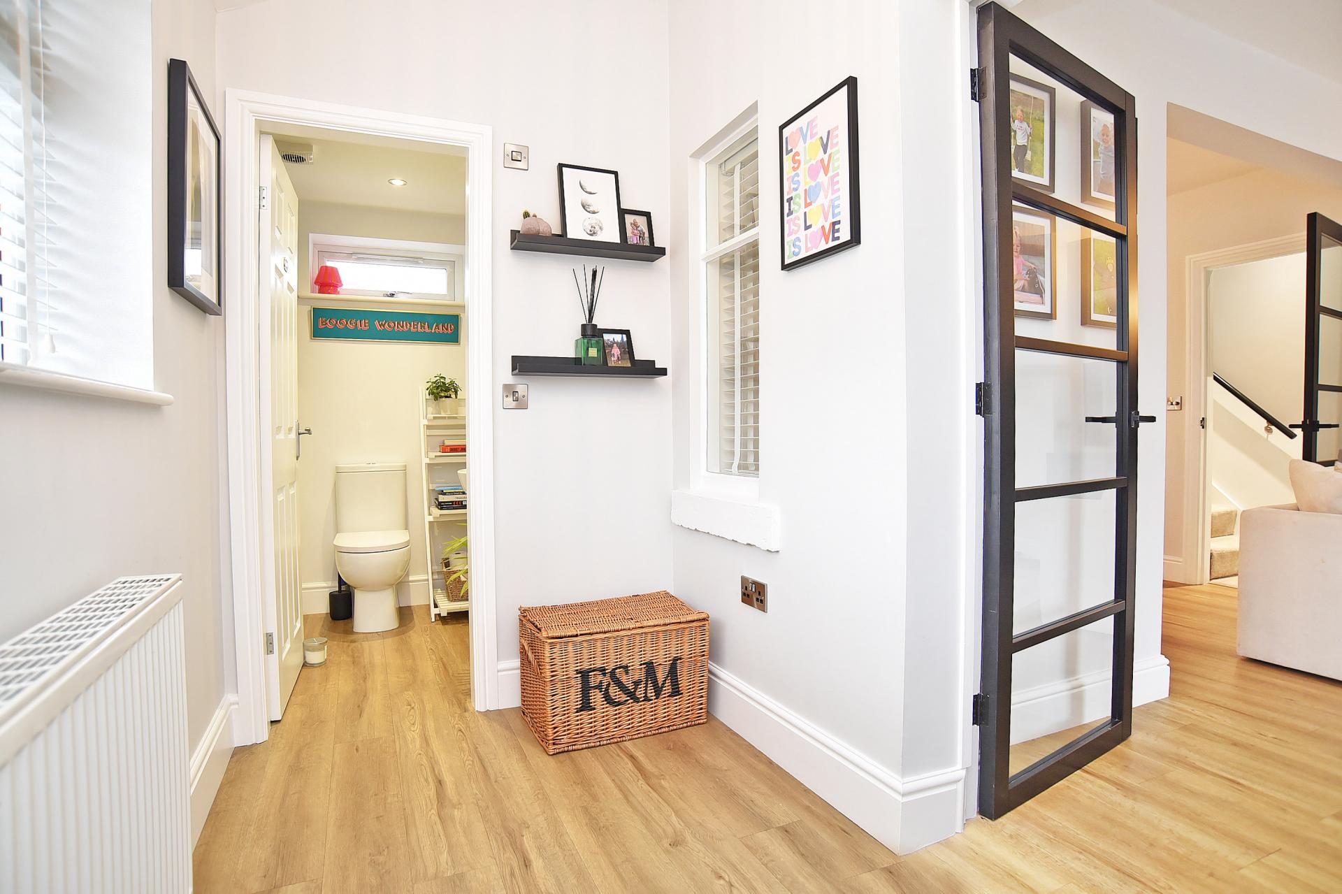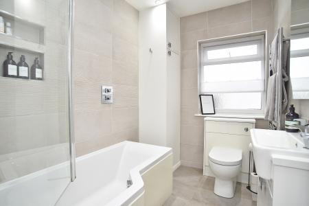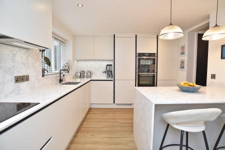 The ground floor accommodation comprises a welcoming reception hall leading through to a generous sitting room with bay window to the front, fitted cabinets and an attractive gas stove. This opens into a formal dining room, creating an excellent flowing living and entertaining space. To the rear there is a fabulous, refitted breakfast kitchen, finished to a high standard with quartz worktops and a range of modern fitted units together with integrated appliances with underfloor heating. There is also a useful downstairs WC.