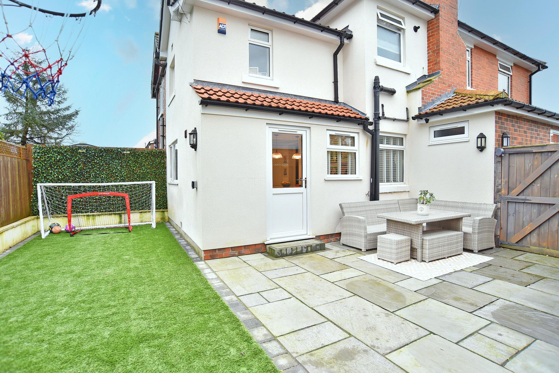 OUTSIDE A wide driveway to the front provides ample off-street parking. To the side and rear of the property there is a low-maintenance paved patio garden with artificial grass ideal for outdoor entertaining and al fresco dining.