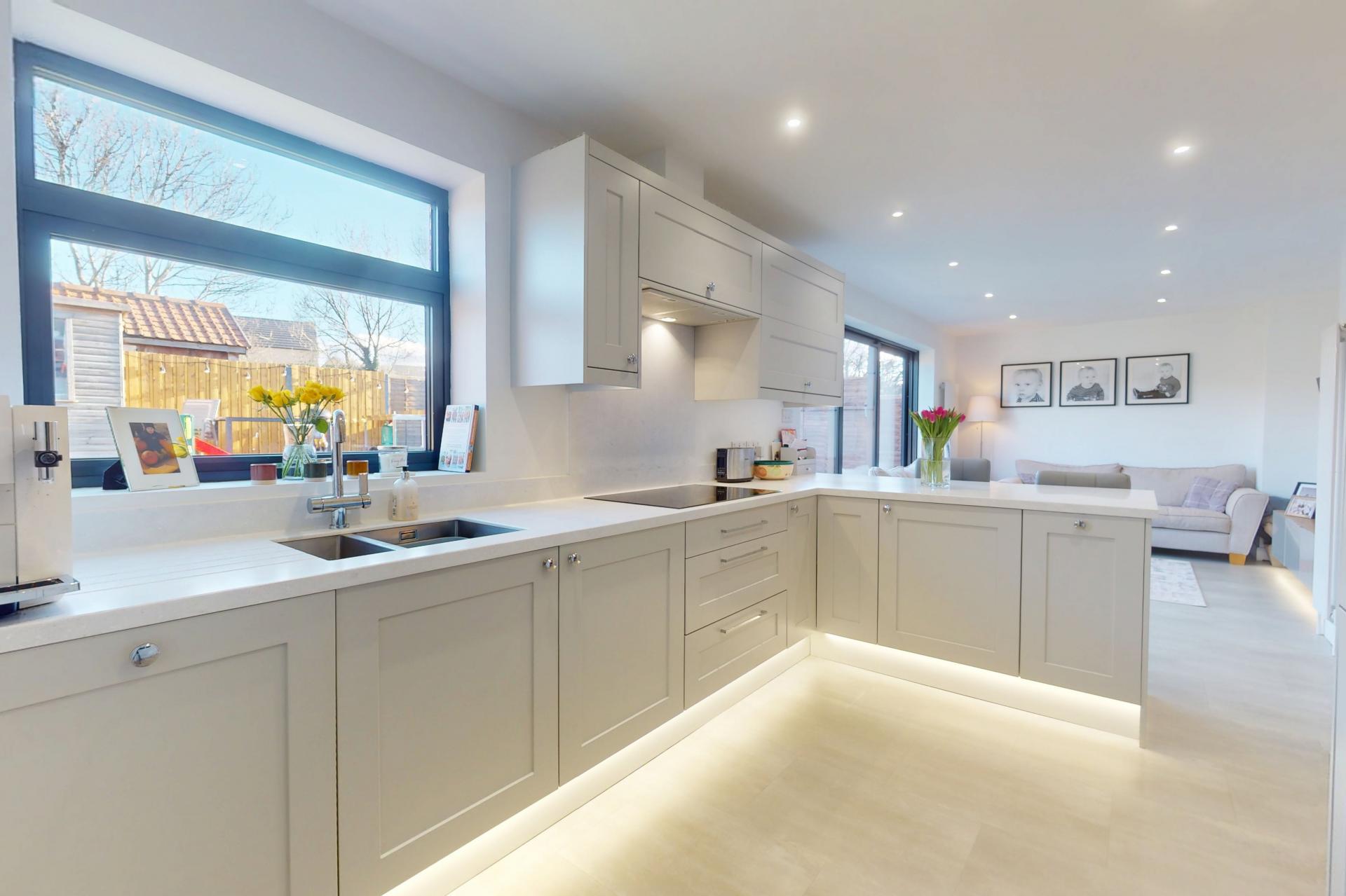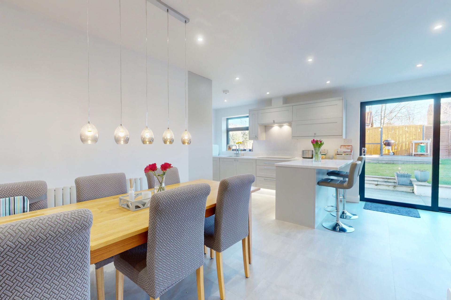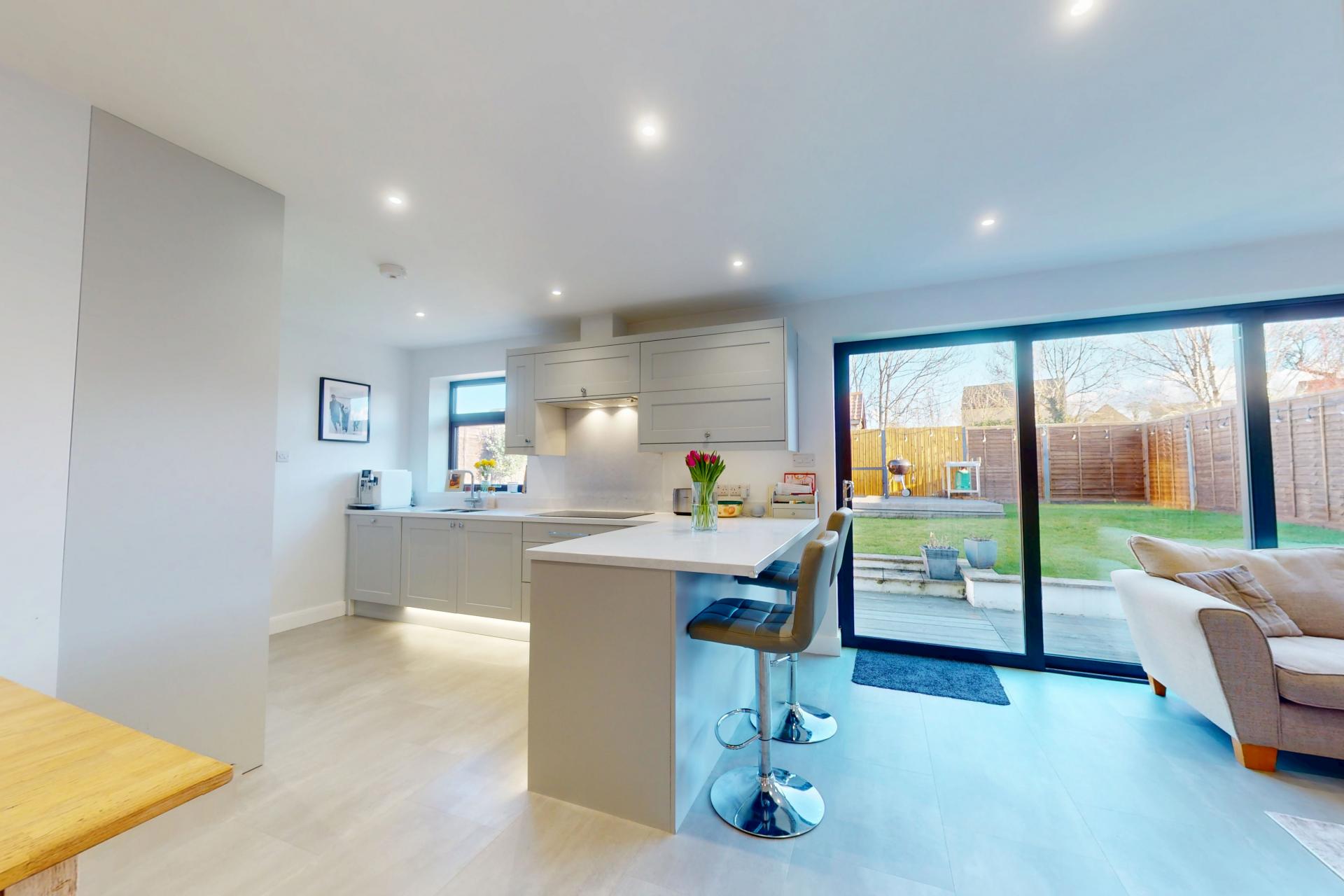 A stunning open-kitchen and living space with sitting and dining areas with glazed sliding doors leading to the garden. The kitchen comprises a range of fitted units with worktop and breakfast bar. Integrated induction hob, double oven, fridge / freezer and dishwasher.
