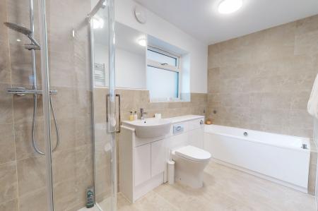A modern white suite comprising WC, washbasin set within a vanity unit, bath and shower. Tiled walls and floor. Heated towel rail.