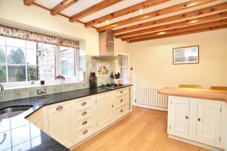 Having a range of wall and base units, built-in table, breakfast bar, black granite work surfaces and integrated appliances.