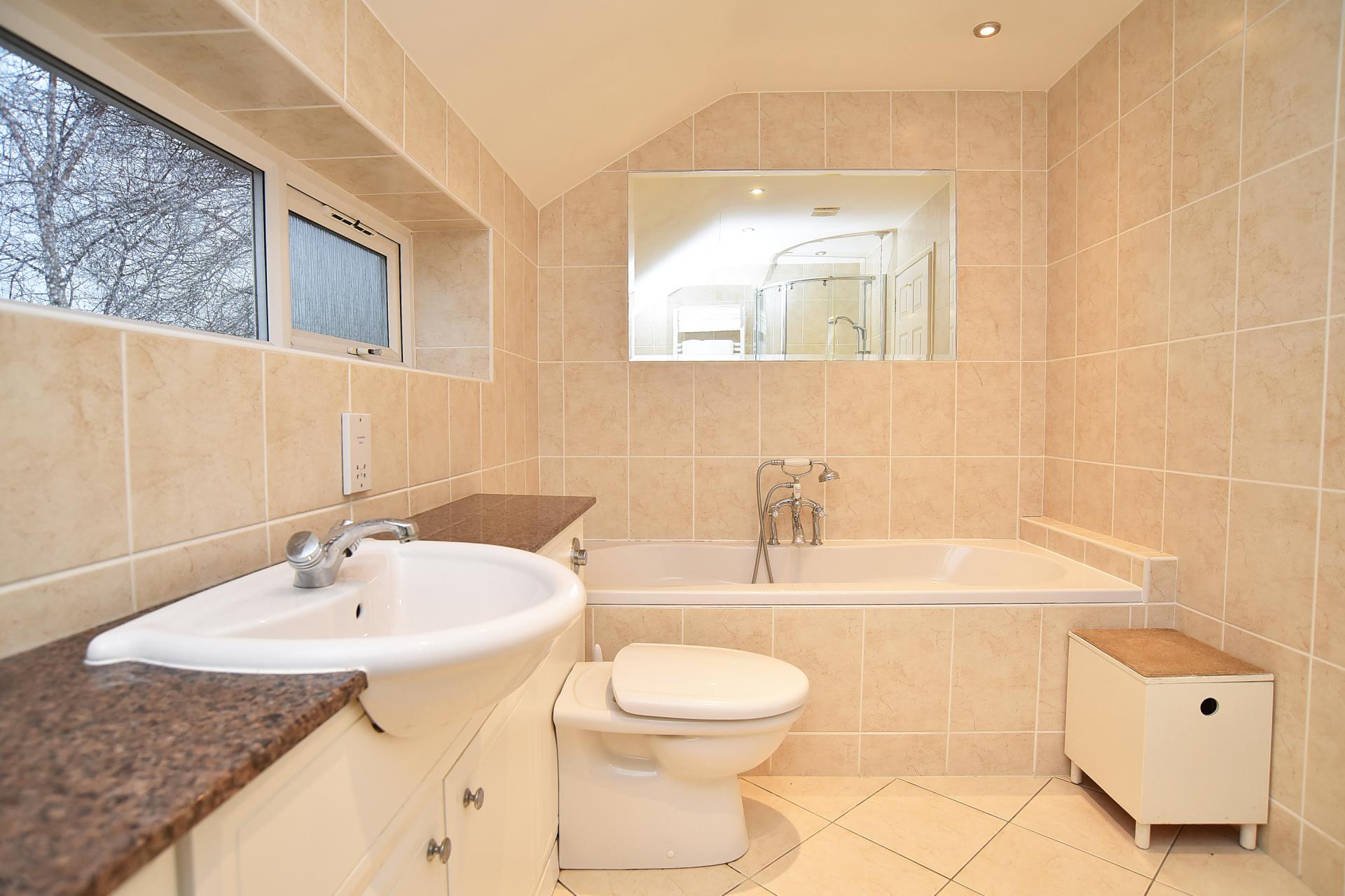To the first floor, a central landing leads to the principal bedroom suite, incorporating fitted wardrobes, a separate dressing area and a large en-suite bathroom fitted with a bath, separate shower, WC and hand basin. There are three further double bedrooms, including bedroom two which benefits from its own modern en-suite shower room, together with a house bathroom fitted with a bath and shower over. All the bedrooms have TV connections.