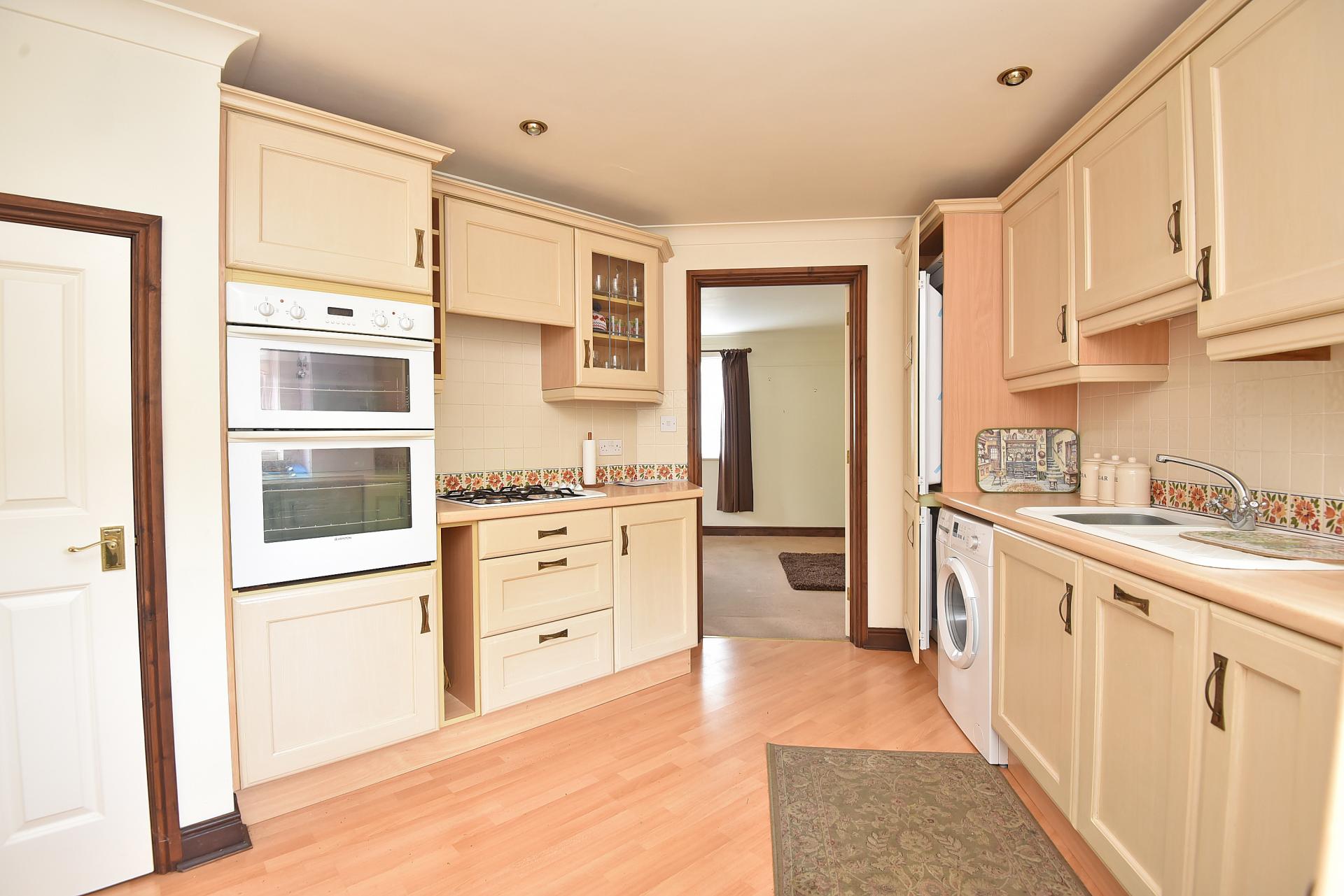 With a range of fitted wall and base units with gas hob, double oven and space for appliances.