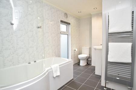 A modern white suite comprising WC, washbasin set within a vanity unit, and bath with shower above. Heated towel rail.