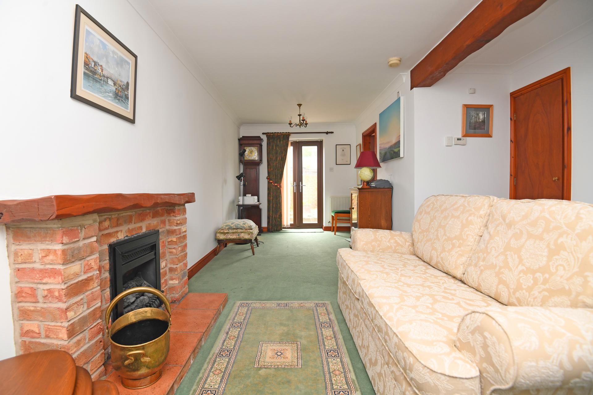 A large open plan reception room with sitting and dining areas with glazed doors leading to the garden and brick fireplace with living flame gas fire. Under stairs cupboard.