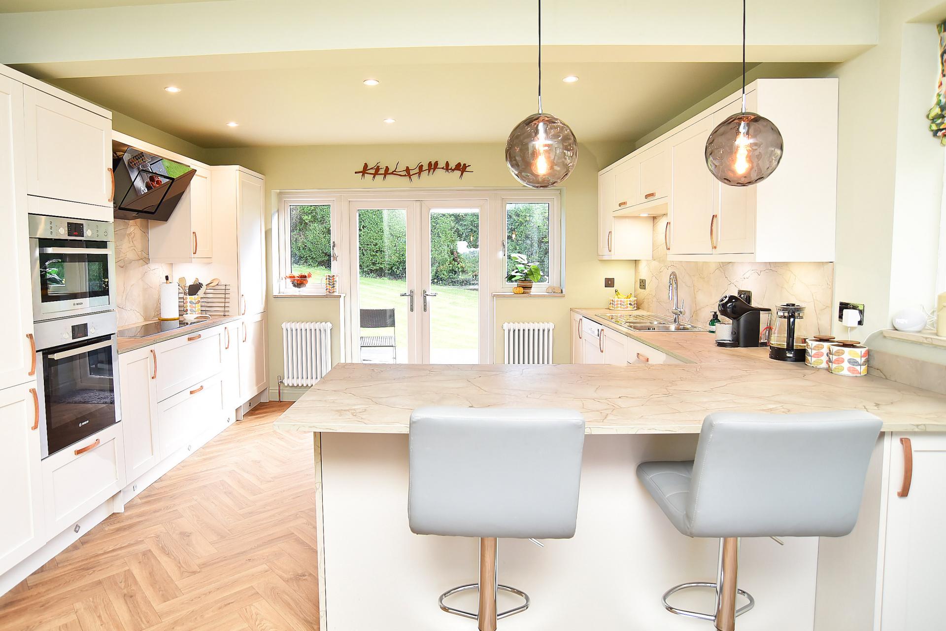 A superb open-plan space with room for a large dining table and a central peninsula breakfast bar. The Shaker-style kitchen offers excellent storage with a range of fitted units, integrated appliances including induction hob, integrated double oven and microwave, full-height fridge, freezer and dishwasher. French doors lead to the south-facing garden.