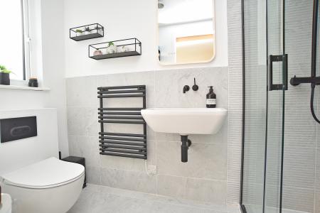 A stunning suite featuring a free-standing bathtub, large walk-in shower, WC, washbasin and heated towel rail.