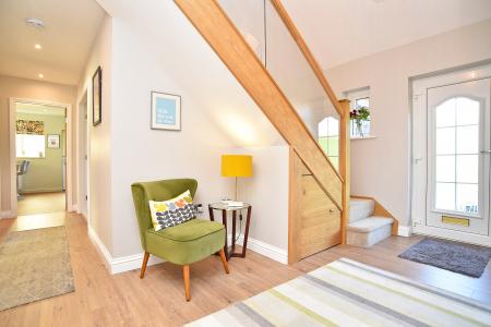 A welcoming central hallway with illuminated oak staircase leading to a galleried landing above.