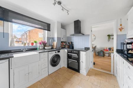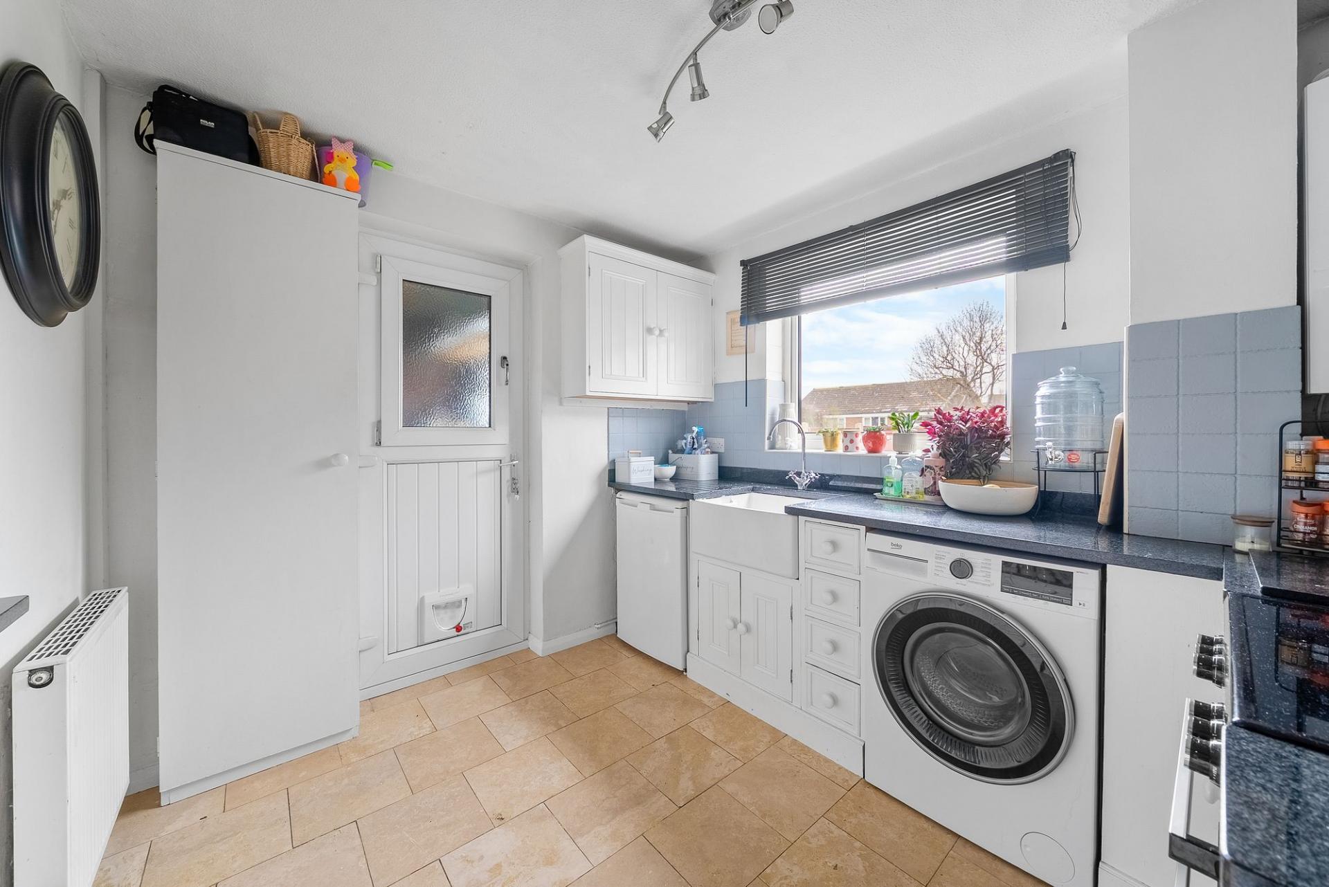 The kitchen is well-appointed and functional, fitted with a range of wall and base units complemented by work surfaces and tiled splashbacks. A window provides natural light, while the layout allows for practical day-to-day use with direct access to the integral garage and connection through to the main living accommodation.