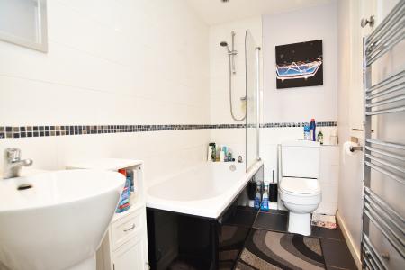 A white suite comprising WC, washbasin, and bath with shower above. Heated towel rail.