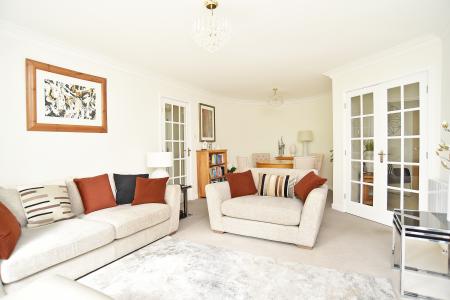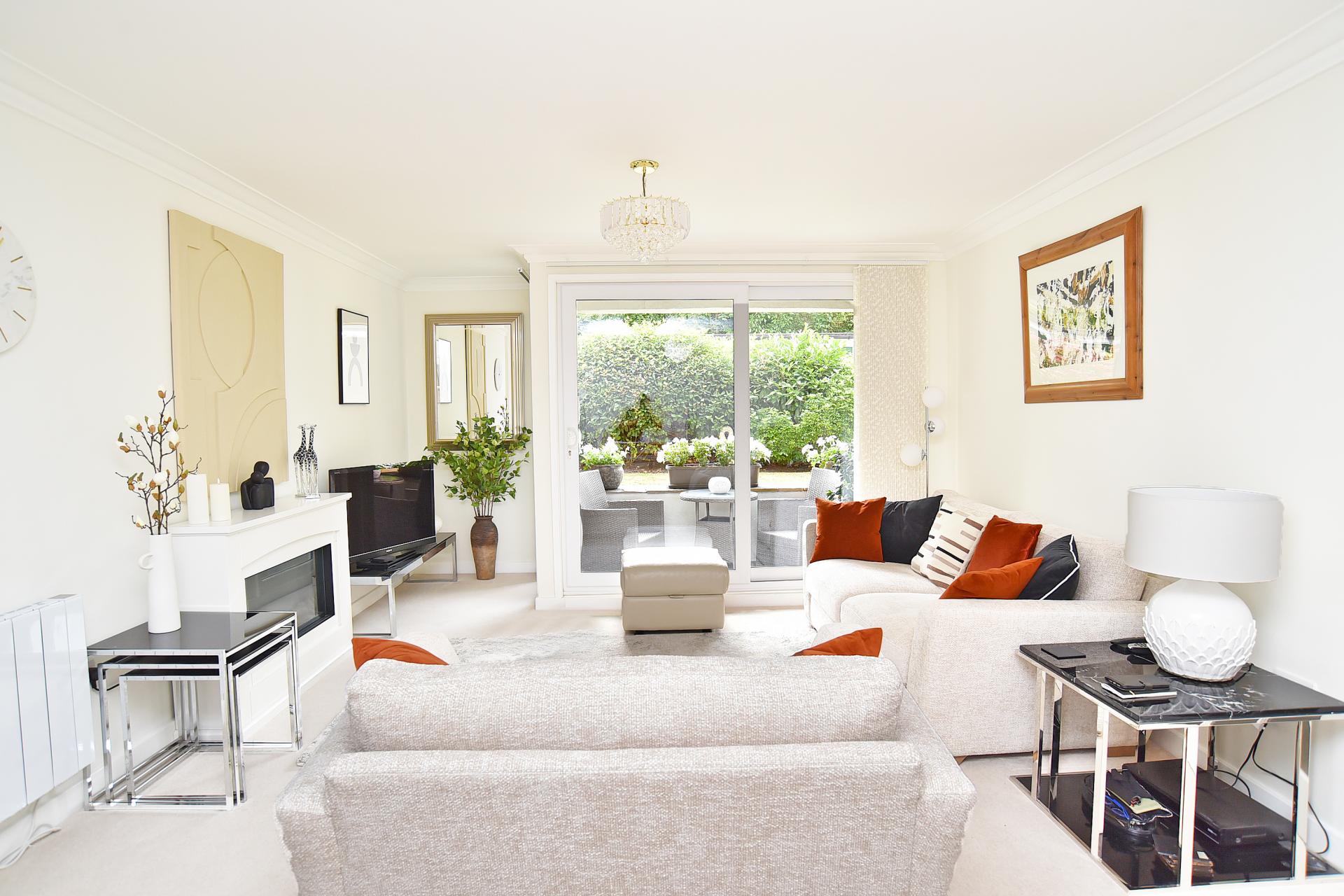 Set within beautifully maintained communal gardens, the building opens via a secure intercom system to a communal lobby. The flat itself provides modern and recently refurbished accommodation with new double glazing throughout and opens to a spacious entrance hall with useful cloaks storage cupboards. Double doors lead into the living room, arranged around a modern fireplace, with a sliding glass door opening onto a covered, south-facing seating terrace. There is space for lounge furniture and a formal dining area with a feature circular wall. The separate modern fitted kitchen presents stylish units with under-cupboard lighting, integrated appliances and quartz work surfaces. Leading off the living room, an inner hallway branches to a newly styled contemporary house bathroom with Italian porcelain tiling, and two excellent-sized double bedrooms – one with an equally stylish en-suite shower room.